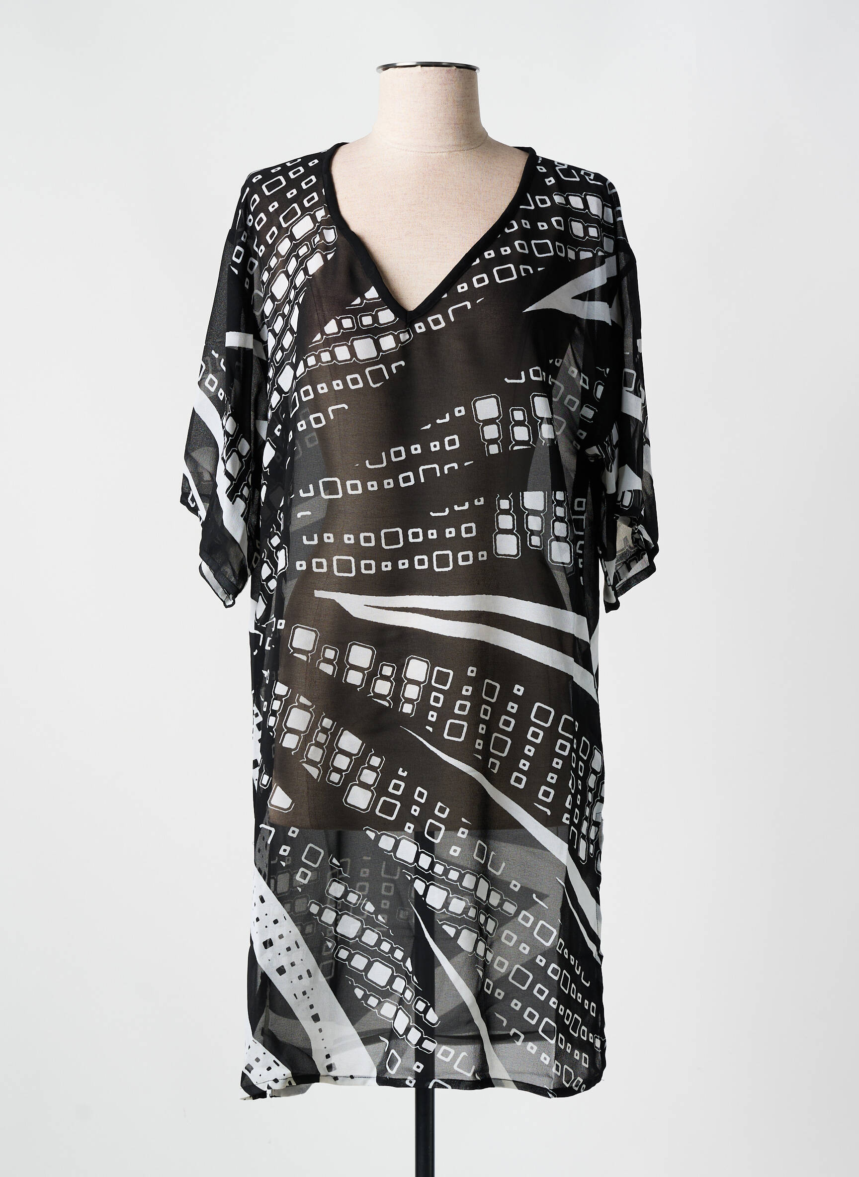 Quand l’élégance rencontre la liberté des vagues, cette robe de plage MIRADONNA pour femme se dévoile en un voile léger et fluide à la silhouette ample, arborant un imprimé graphique noir et blanc où s’entrelacent motifs géométriques et lignes dynamiques, sublimant chaque mouvement avec une touche de modernité subtile et raffinée.