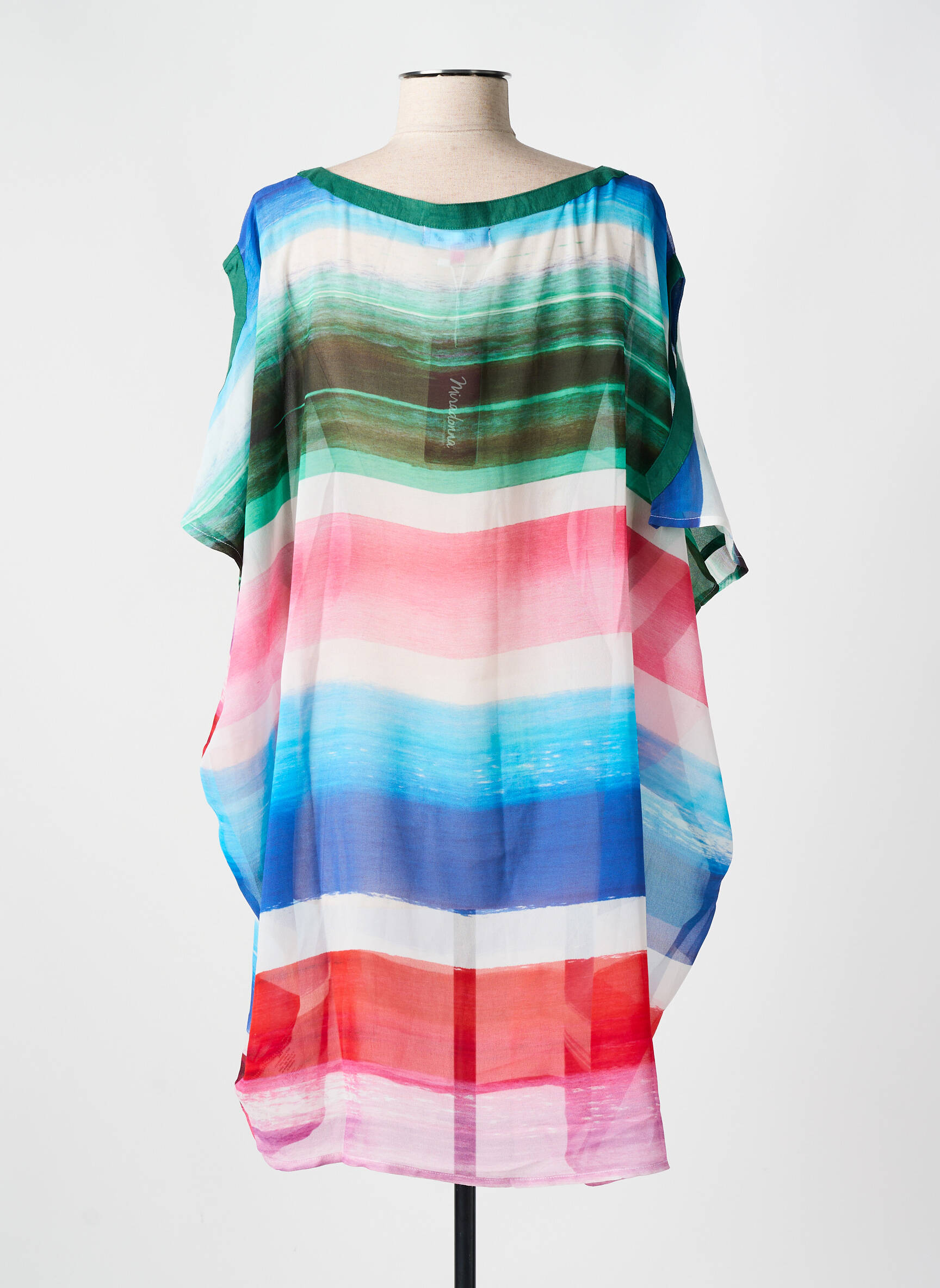 Imaginez une promenade au bord de l'eau où les couleurs du coucher de soleil jouent avec la brise : cette robe de plage MIRADONNA pour femme capture parfaitement cette sensation grâce à ses larges bandes horizontales aux teintes vibrantes mêlant bleu, vert, rose, rouge et touches de blanc, le tout dans un tissu léger et légèrement transparent qui laisse deviner subtilement la silhouette tout en offrant une coupe ample et fluide pour un confort absolu.