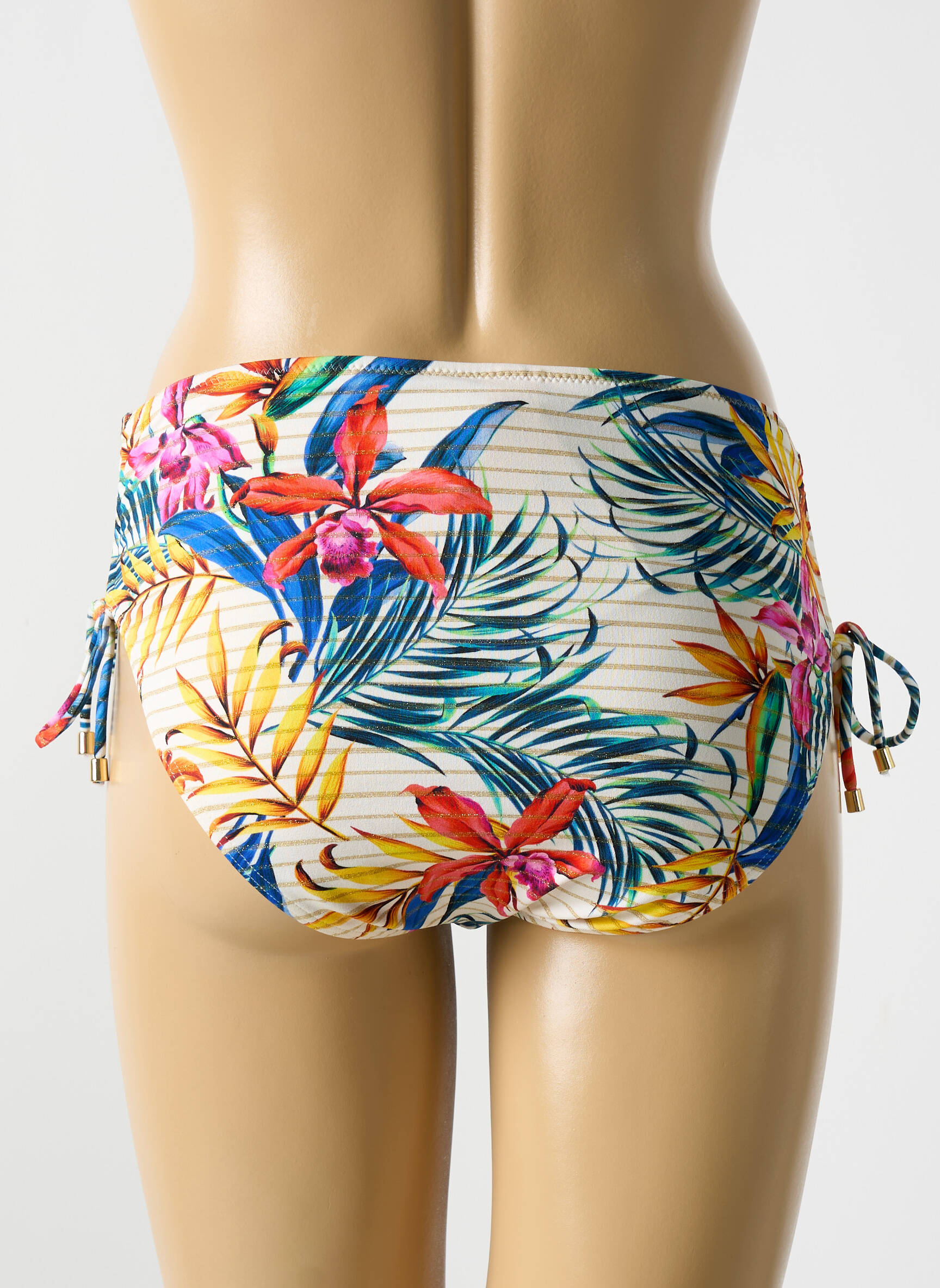 Comme une invitation à s’évader sous les tropiques, ce bas de maillot de bain CYELL pour femme marie avec élégance un motif floral exotique aux couleurs vives sur un fond aux fines rayures neutres, sublimé par des liens ajustables sur les côtés qui apportent une touche de charme et offrent un ajustement parfait, révélant ainsi une silhouette harmonieuse et pleine de fraîcheur.