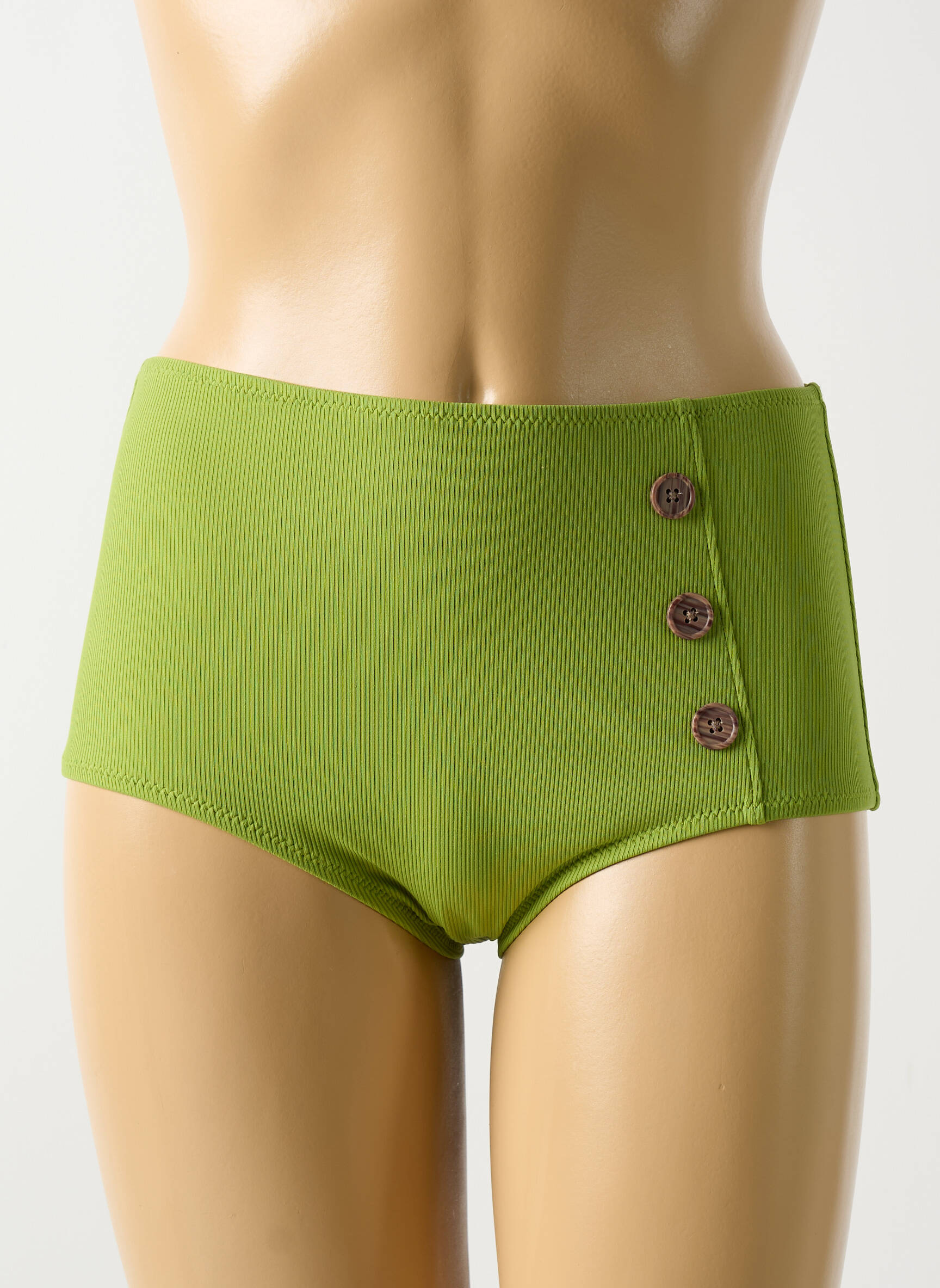 Imaginez un bas de maillot qui réinvente la simplicité avec une touche d'élégance subtile : ce modèle de la marque CYELL se distingue par sa coupe taille haute enveloppante qui offre un confort optimal tout en mettant en valeur la silhouette. Teinté d’un vert frais et lumineux, ce bas présente une texture délicate en légère nervure qui ajoute du relief à son design épuré, tandis que trois petits boutons décoratifs placés sur le côté apportent une note raffinée et originale sans jamais alourdir l’ensemble. Parfait pour celles qui cherchent à allier modernité et sophistication discrète dans leur look de plage.