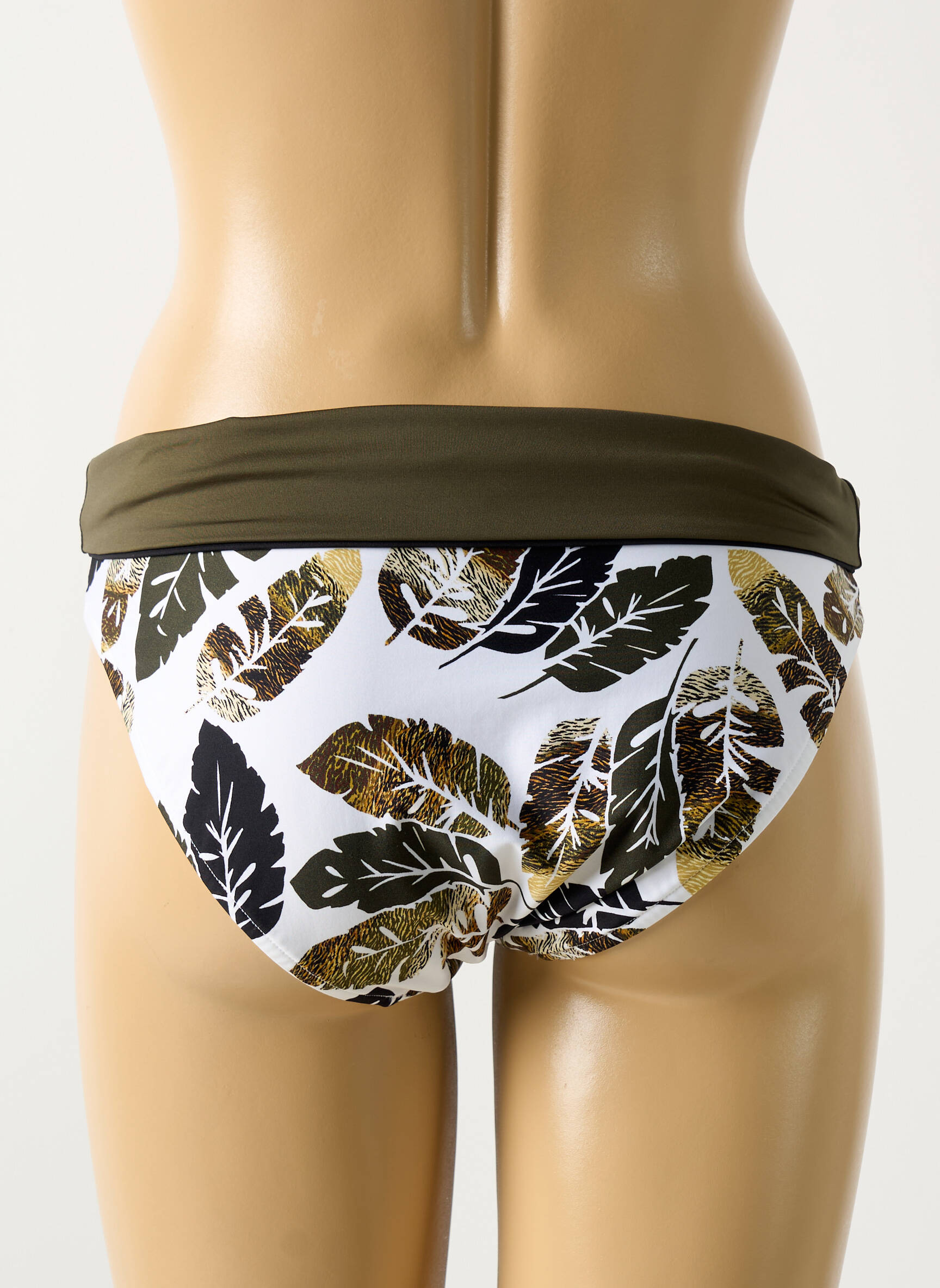 Osez un voyage tropical qui habille votre silhouette avec élégance grâce à ce bas de maillot de bain Lise Charmel, où un motif feuillage en nuances d’or et de noir s’épanouit sur un fond blanc éclatant, tandis que la taille souple et légèrement roulottée dans un vert kaki profond apporte une touche moderne et raffinée.