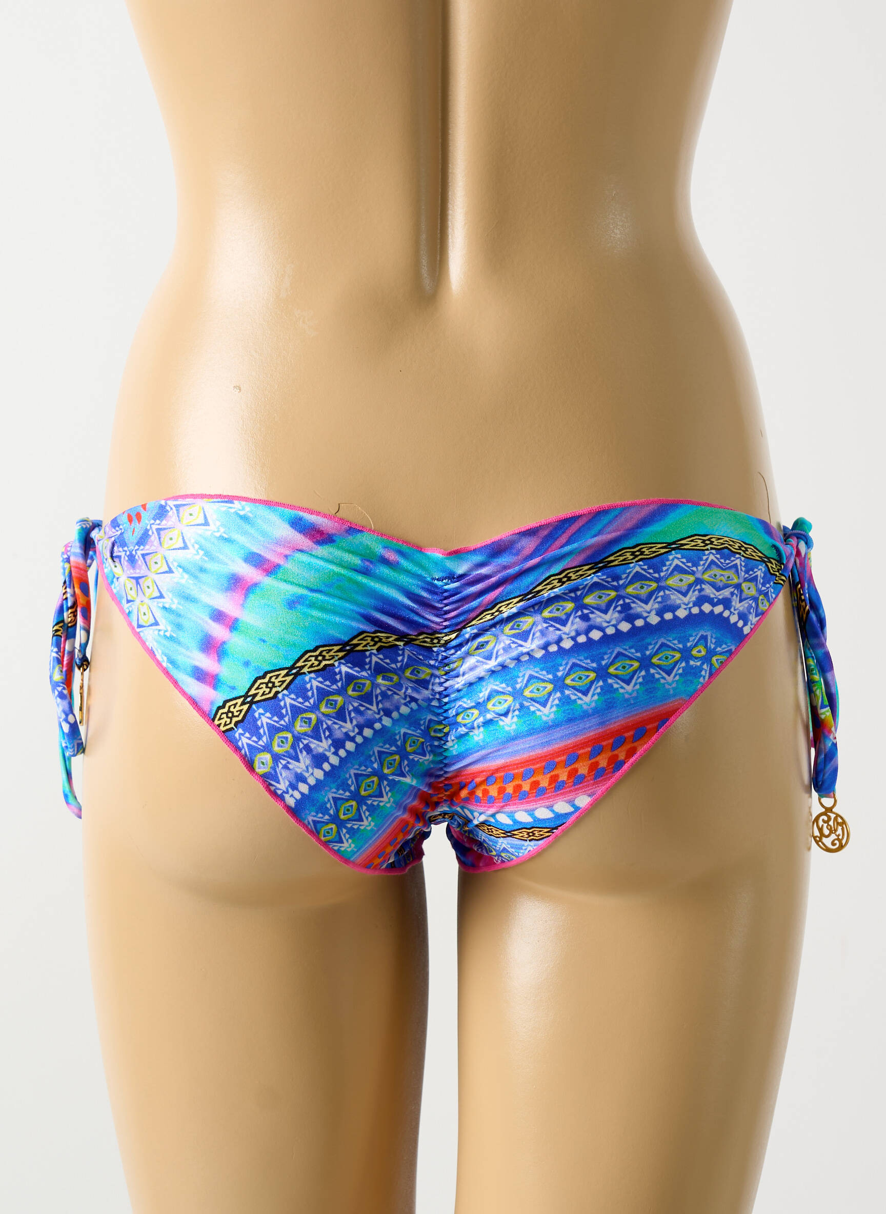 Imaginez un coucher de soleil tropical capturé dans un bas de maillot de bain : ce modèle signé LULI FAMA déploie un imprimé chatoyant aux teintes vibrantes de bleu, violet, jaune et touches rosées, subtilement enlacé de motifs géométriques aux accents ethniques. Sa coupe finesse et basse est rehaussée de liens latéraux ajustables, ornés d’un petit médaillon doré qui apporte une touche de raffinement délicate et ludique à ce maillot qui invite à l’évasion.