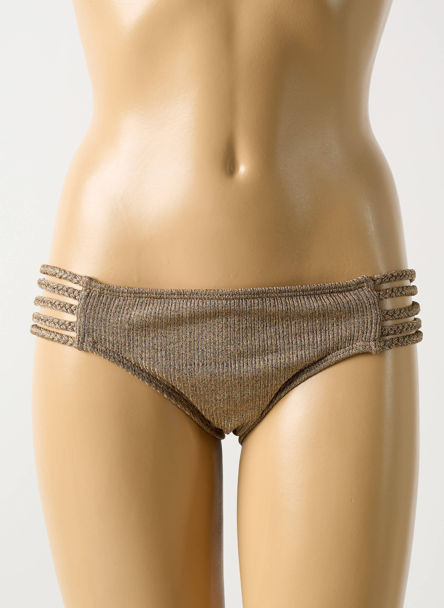 Imaginez un bas de maillot qui allie subtilement sensualité et modernité avec ses fines bandes multiples sur les côtés qui ouvrent la silhouette tout en assurant un maintien élégant grâce à sa coupe classique ajustée, le tout dans un tissu légèrement brillant couleur bronze qui capte la lumière pour une touche sophistiquée et glamour.