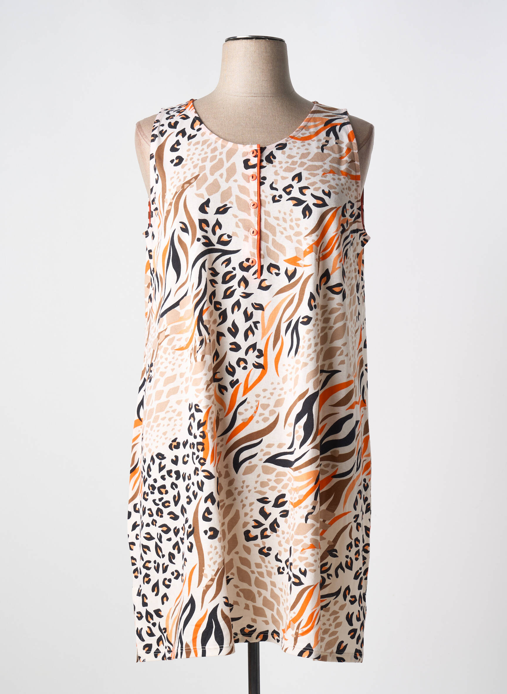 Offrez-vous une chemise de nuit élégante de la marque MASSANA à prix mini et profitez d’un vrai bon plan pour votre garde-robe cocooning. Ce modèle pour femme séduit par son imprimé animalier tendance mêlant des tons beige, orange et noir, tandis que sa coupe sans manches et sa petite fermeture zippée à l’avant garantissent un confort optimal tout au long de la nuit. Idéale pour celles qui veulent allier style et économie sans compromis.