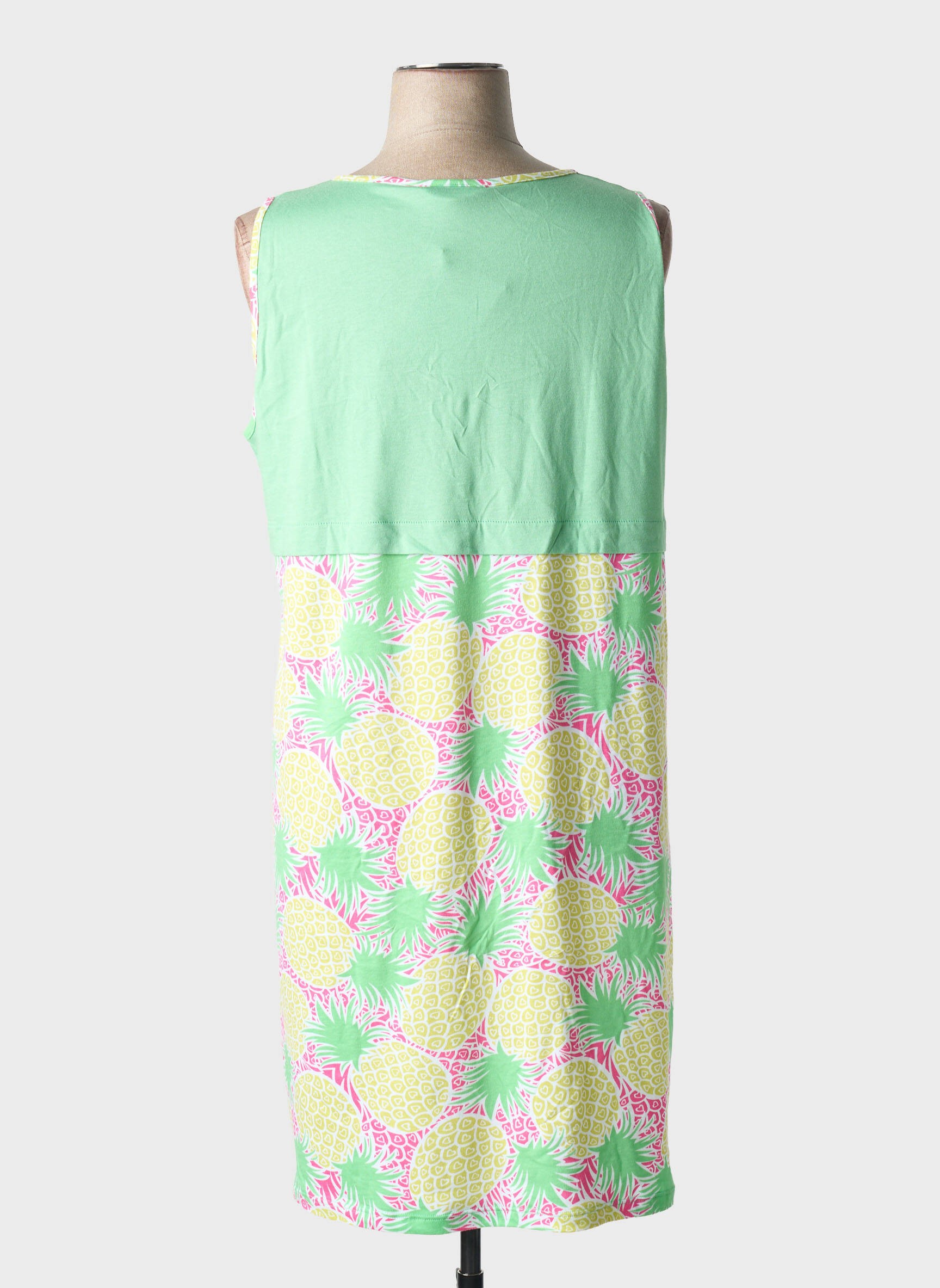 Envie de craquer pour une chemise de nuit tendance à petit prix ? Ce modèle proposé par MASSANA est une vraie opportunité pour miser sur le confort sans se ruiner ! Son haut uni dans un vert pastel tout doux se marie parfaitement avec le bas à motif ananas aux couleurs fraîches et estivales, pour une touche de fantaisie et de bonne humeur jusque dans vos moments de détente. Sans manches et légèrement évasée, elle offre une grande liberté de mouvement, idéale pour des nuits agréables à petit budget.