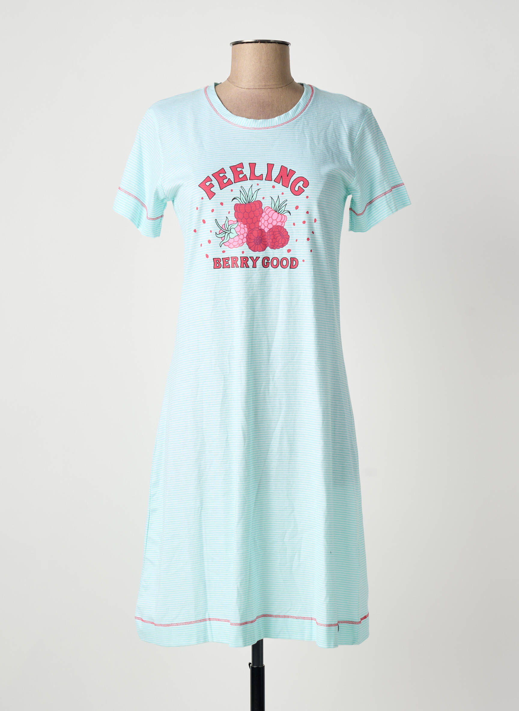 Profitez d'un vrai bon plan avec cette chemise de nuit pour femme signée REBELLE BY PASTUNETTE, affichant un coloris bleu pastel rafraîchissant et un motif fruité plein d'optimisme avec l’inscription "Feeling Berry Good" sur le devant, idéale pour allier douceur, confort et bonne humeur à prix mini, parfaite pour des nuits détendues sans vous ruiner.