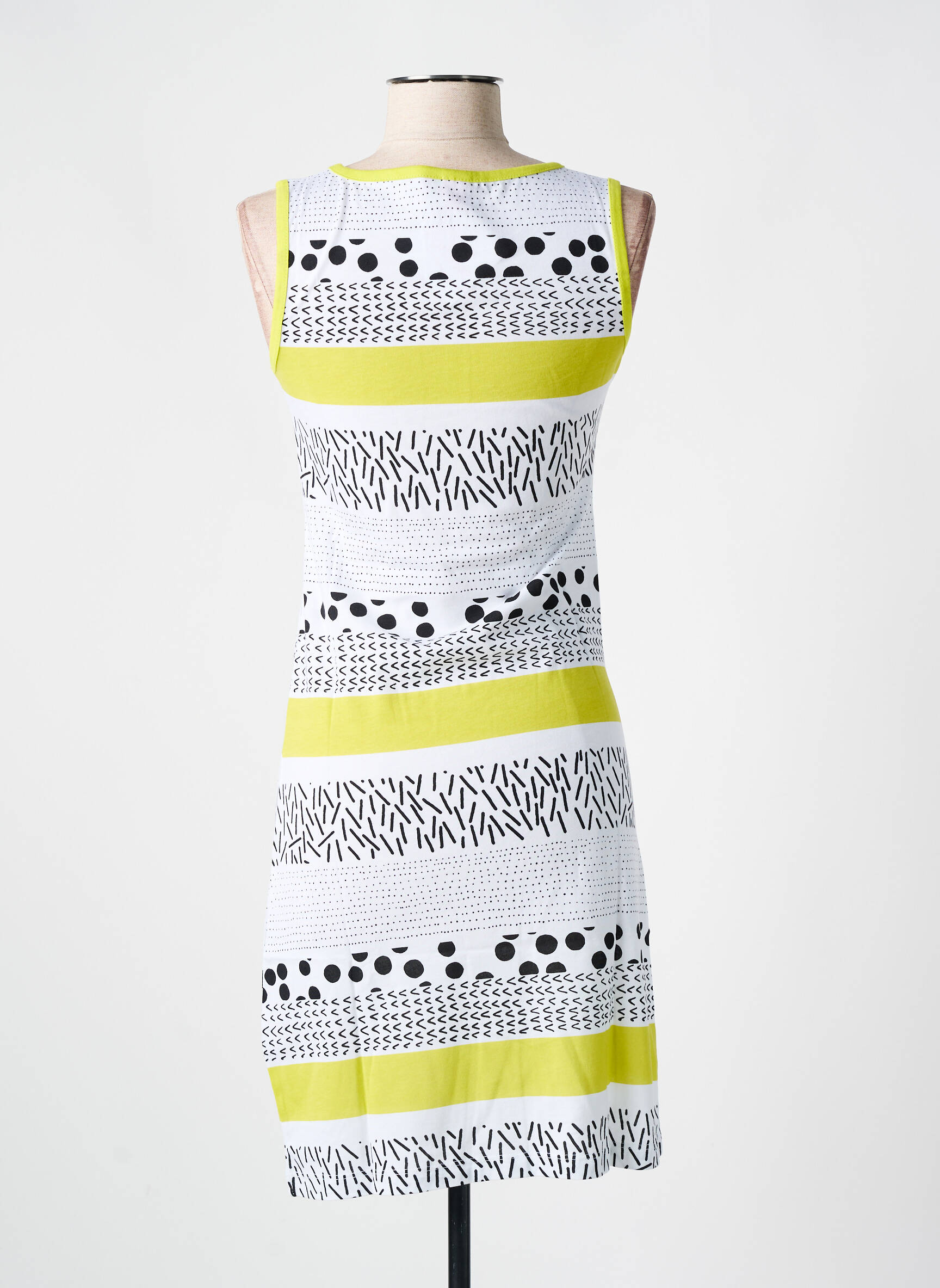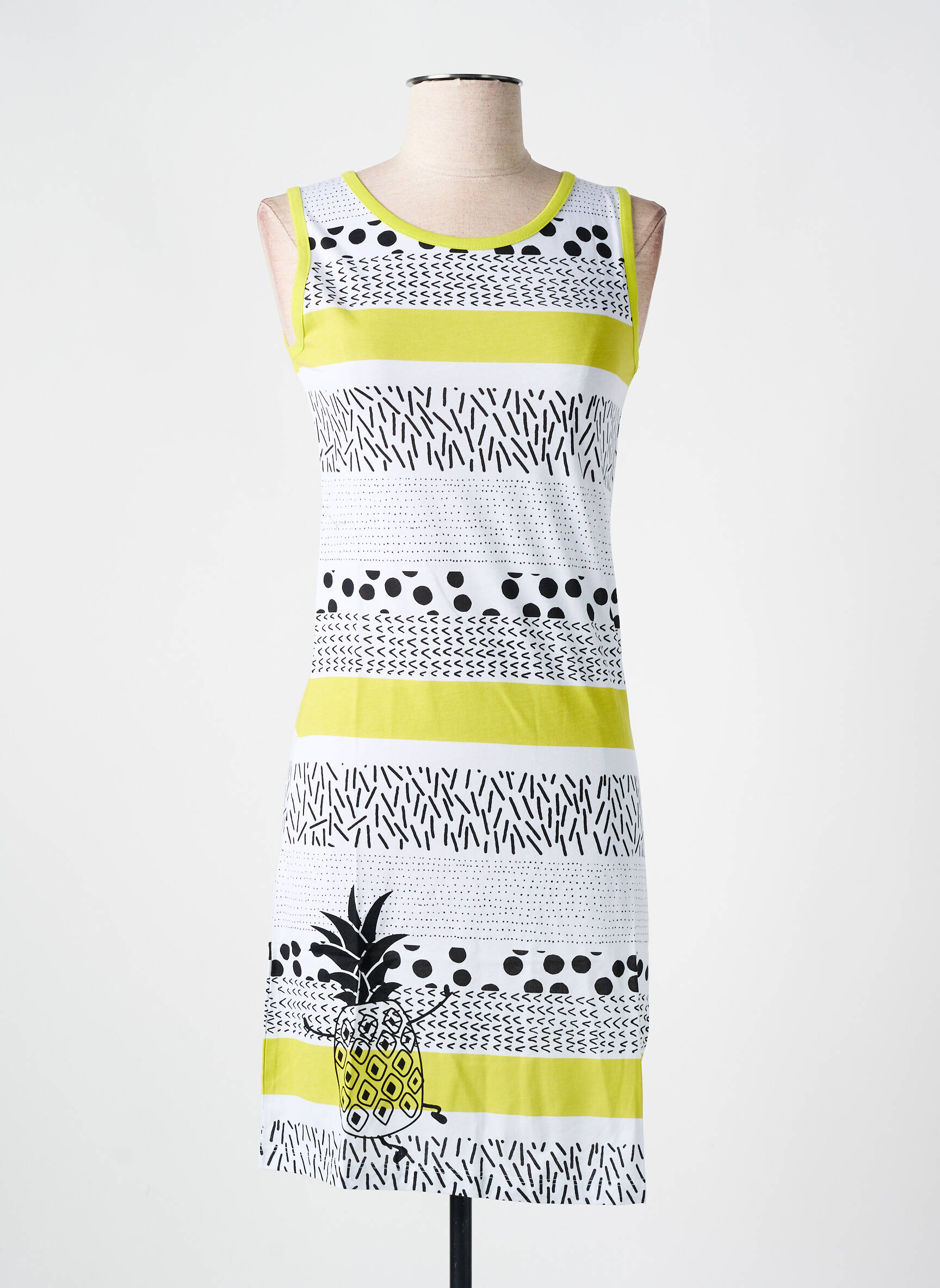 Plongez dans un univers de douceur et de fraîcheur avec cette chemise de nuit de la marque ROSE POMME. Son design captivant se distingue par des motifs graphiques noirs et blancs, entrecoupés de bandes vibrantes de couleur jaune, ajoutant une touche enjouée à votre garde-robe nocturne. La silhouette sans manches et le décolleté arrondi favorisent une aisance parfaite, idéale pour des nuits paisibles. Avec son motif de belle ananas en bas, cette pièce combine confort et style, transformant chaque moment de repos en une véritable escapade. Adoptez cette chemise de nuit pour une nuit placée sous le signe de la légèreté et de la bonne humeur.