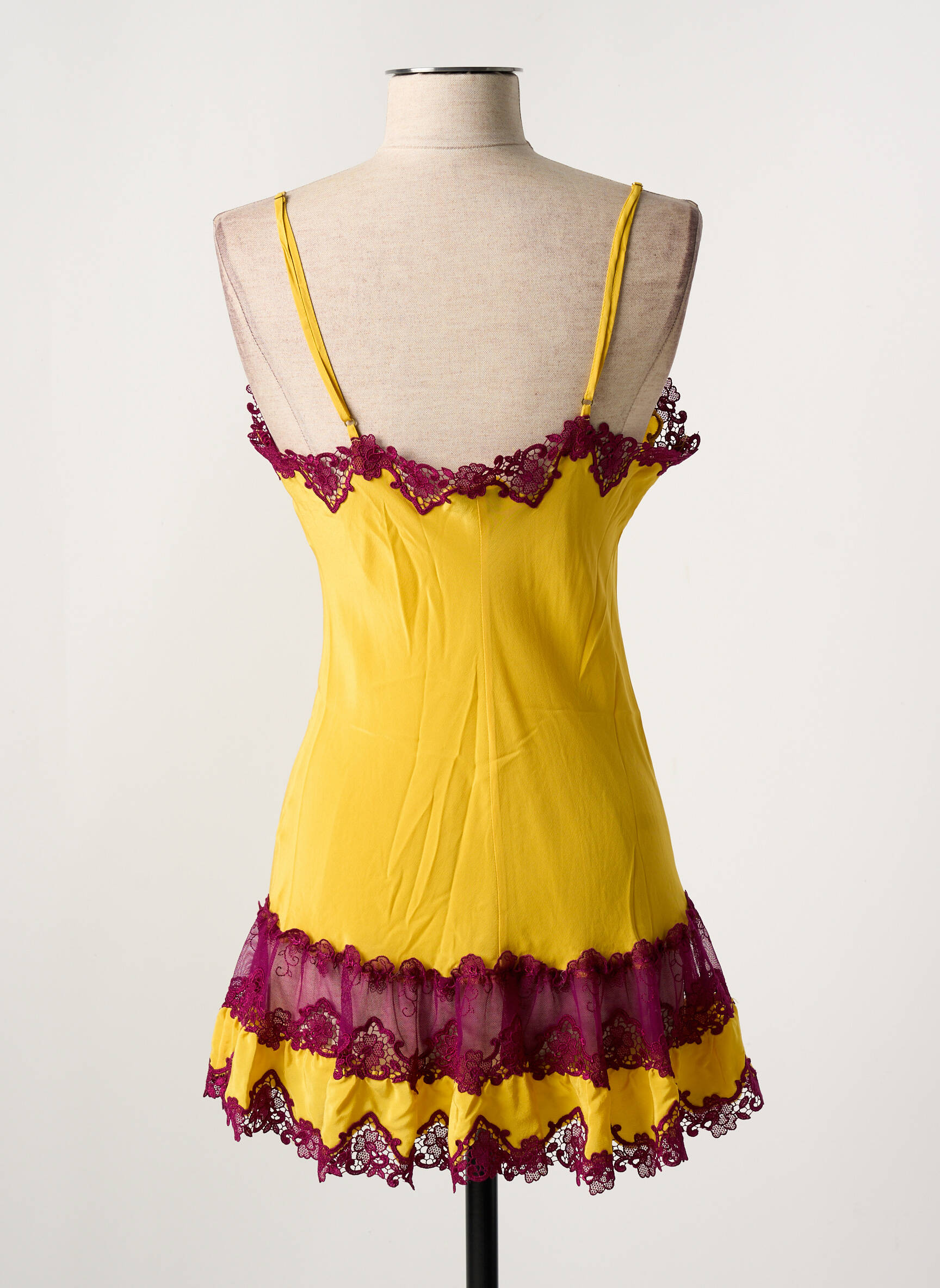 Craquez pour cette nuisette MARJOLAINE à prix mini, un véritable bon plan pour apporter une touche de raffinement à votre garde-robe de nuit. Avec sa coupe délicatement ajustée, son tissu jaune éclatant rehaussé de dentelle violette contrastante et ses finitions soignées, elle offre une allure à la fois féminine et sophistiquée sans vous ruiner. Profitez de l’élégance signature de la marque à prix déstocké et faites-vous plaisir sans culpabiliser sur votre budget.