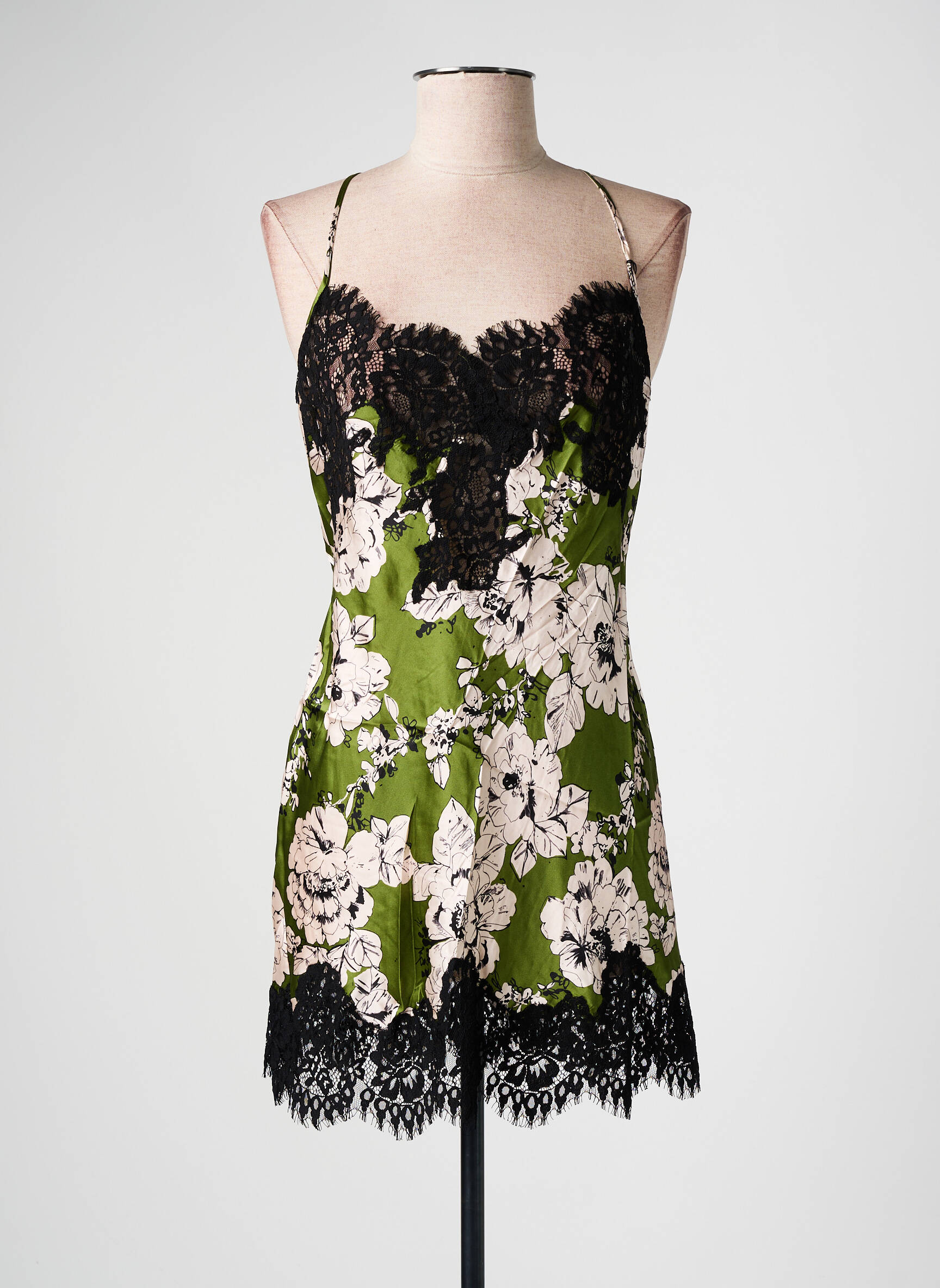 Voici une occasion rêvée de s’offrir une pièce de lingerie haut de gamme à prix doux avec cette nuisette MARJOLAINE pour femme, proposée en déstockage exclusif. Ce modèle séduit par son raffinement exceptionnel, mêlant une délicate dentelle noire en contraste avec un tissu satiné vert rehaussé de motifs floraux clairs, le tout soulignant élégamment la silhouette. Les fines bretelles et les finitions en dentelle font de cette nuisette une tenue aussi confortable que séduisante, idéale pour celles qui recherchent à la fois élégance et économie.