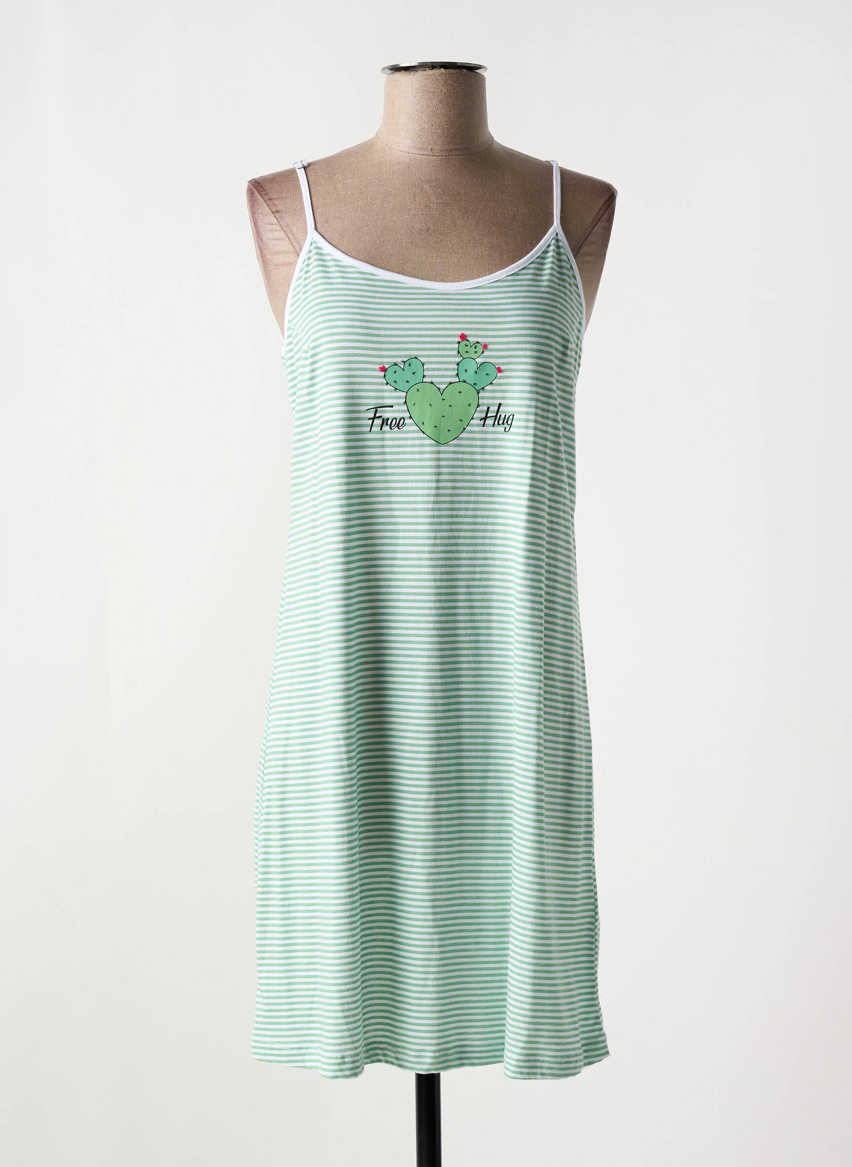 Plongez dans un univers plein de douceur avec cette nuisette de la marque RINGELLA qui évoque la légèreté des journées ensoleillées. Arborant un fond vert clair délicatement rayé, elle est ornée d'un motif amusant représentant un cactus joyeusement coloré, accompagné de l'inscription "Free Hugs". Les fines bretelles ajoutent une touche délicate à cette pièce, rendant le tout à la fois confortable et féminine. Idéale pour se prélasser à la maison ou passer des nuits paisibles, cette nuisette combine style et aisance, apportant une note ludique à votre garde-robe de nuit.