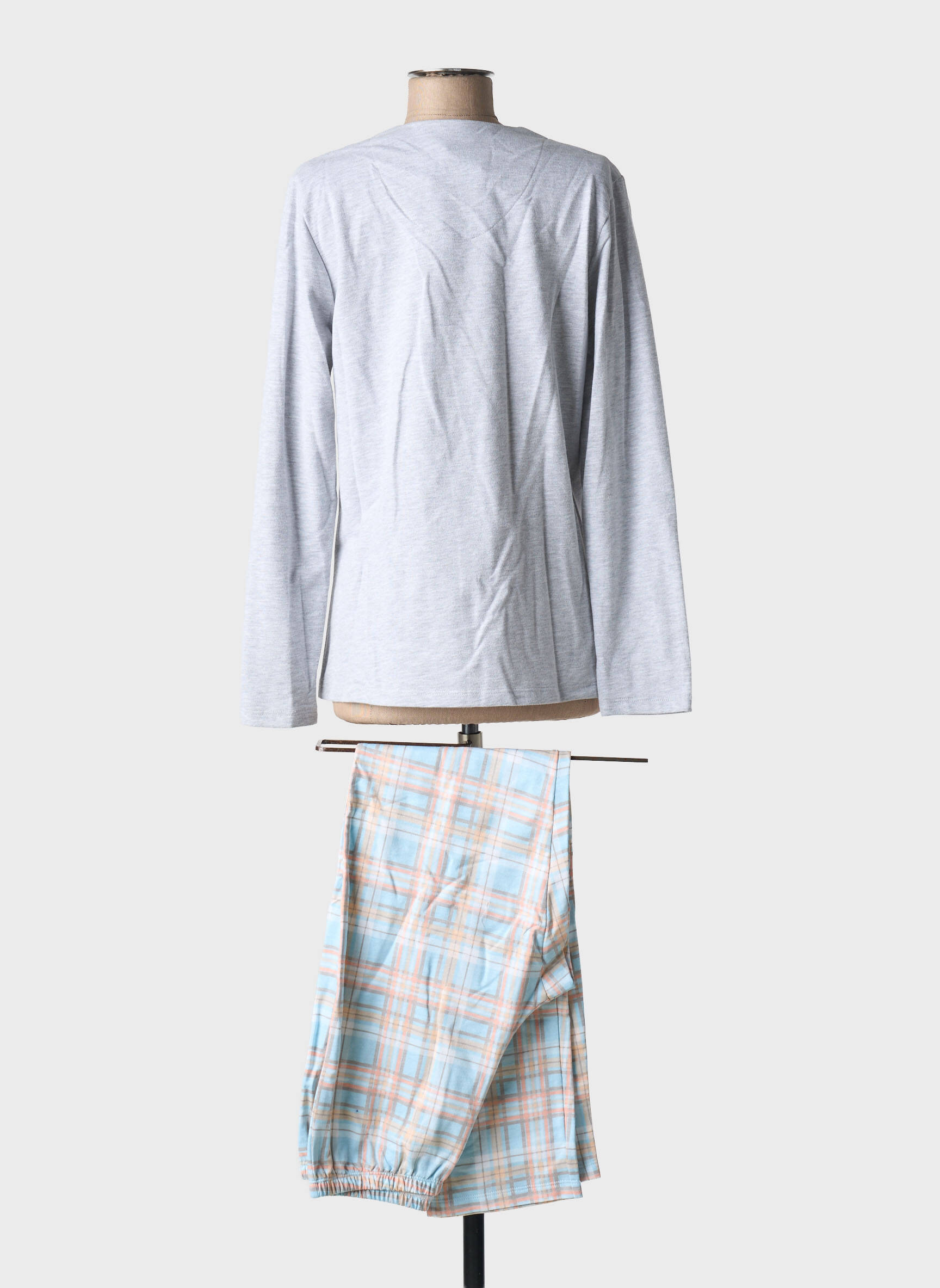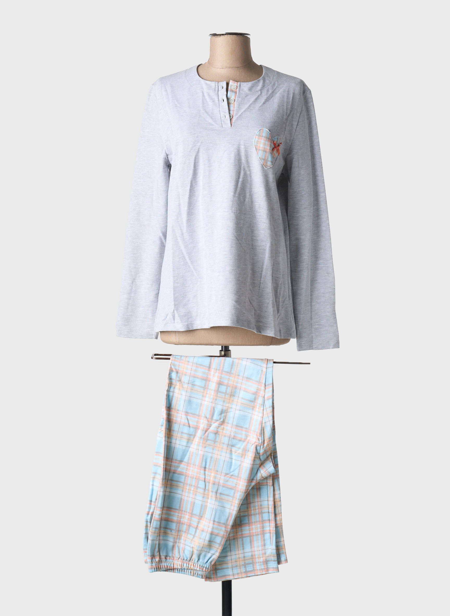 Craquez pour ce pyjama femme de la marque EGATEX, un vrai bon plan pour allier confort et style à petit prix, avec son haut gris à manches longues orné d’une petite poche à motif et son pantalon à carreaux pastel, parfait pour des nuits douces et économiques.