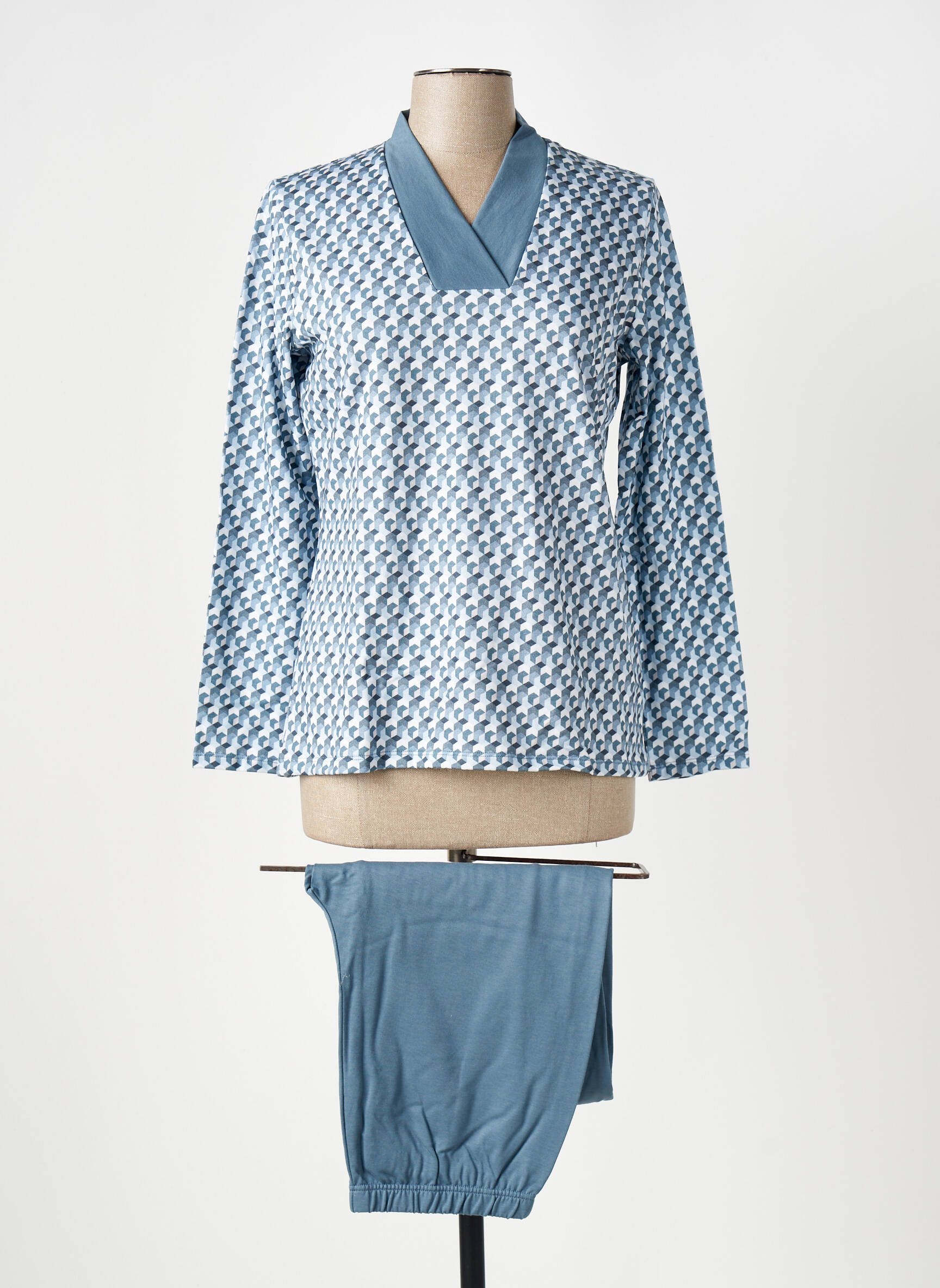 Profitez d'un excellent rapport qualité-prix avec ce pyjama IMPETUS pour femme, parfait pour passer des nuits douces sans vous ruiner. Son haut présente un élégant motif graphique bleu et blanc associé à un col en V uni, tandis que le pantalon bleu assorti ajoute une touche de simplicité et de confort, idéal pour celles qui cherchent à allier style et économies lors de leurs achats.