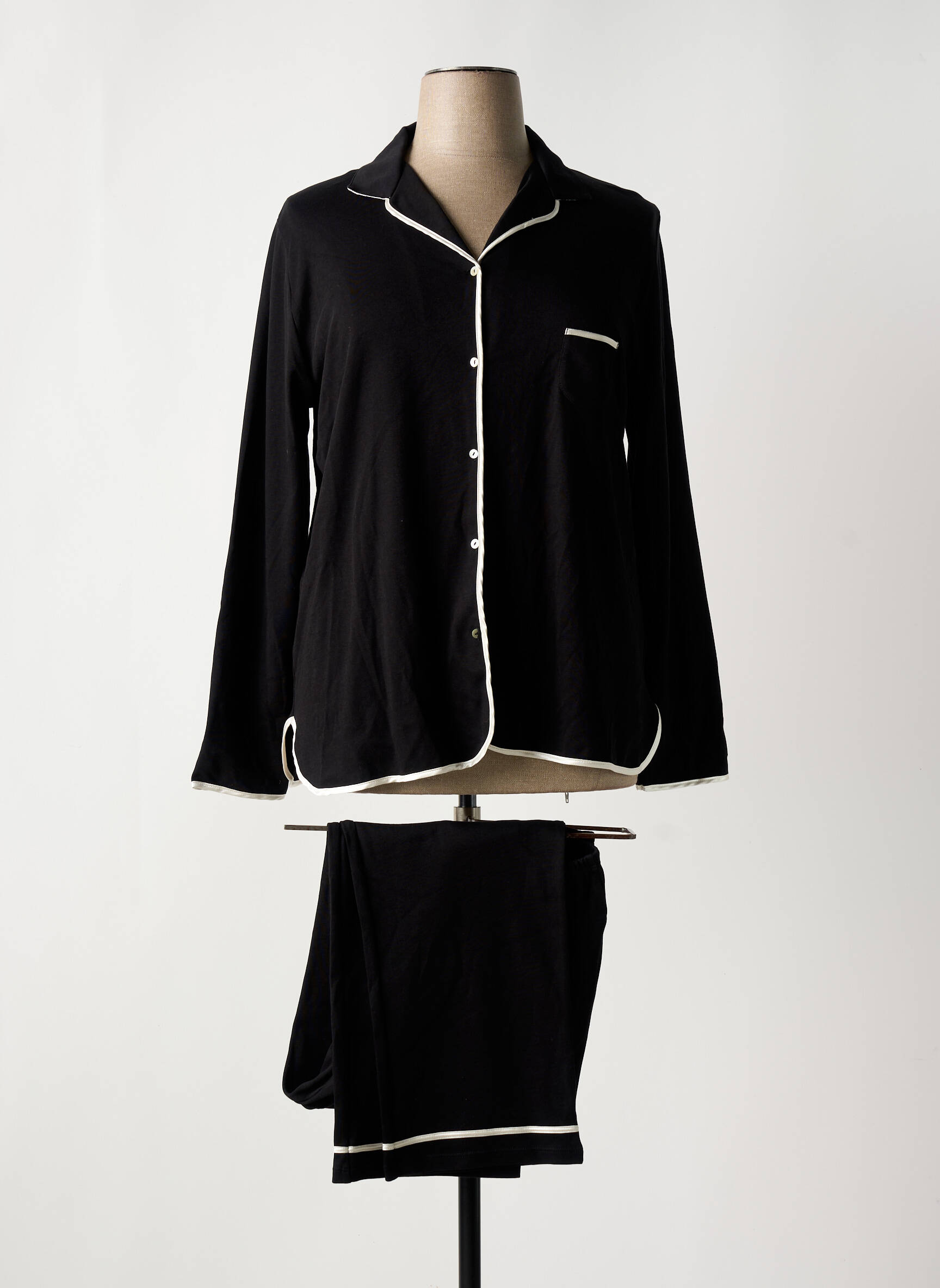 Offrez-vous le confort chic à prix malin avec ce pyjama pour femme de la marque LE CHAT, un essentiel à petit prix pour vos soirées cocooning. Cet ensemble noir au style intemporel séduit par ses finitions passepoilées blanches qui soulignent élégamment les bords du haut boutonné, ainsi que le pantalon assorti pour un look raffiné même à la maison. Profitez d’un excellent rapport qualité-prix pour vous offrir une pièce élégante qui allie douceur et simplicité, idéale pour se détendre sans se ruiner.