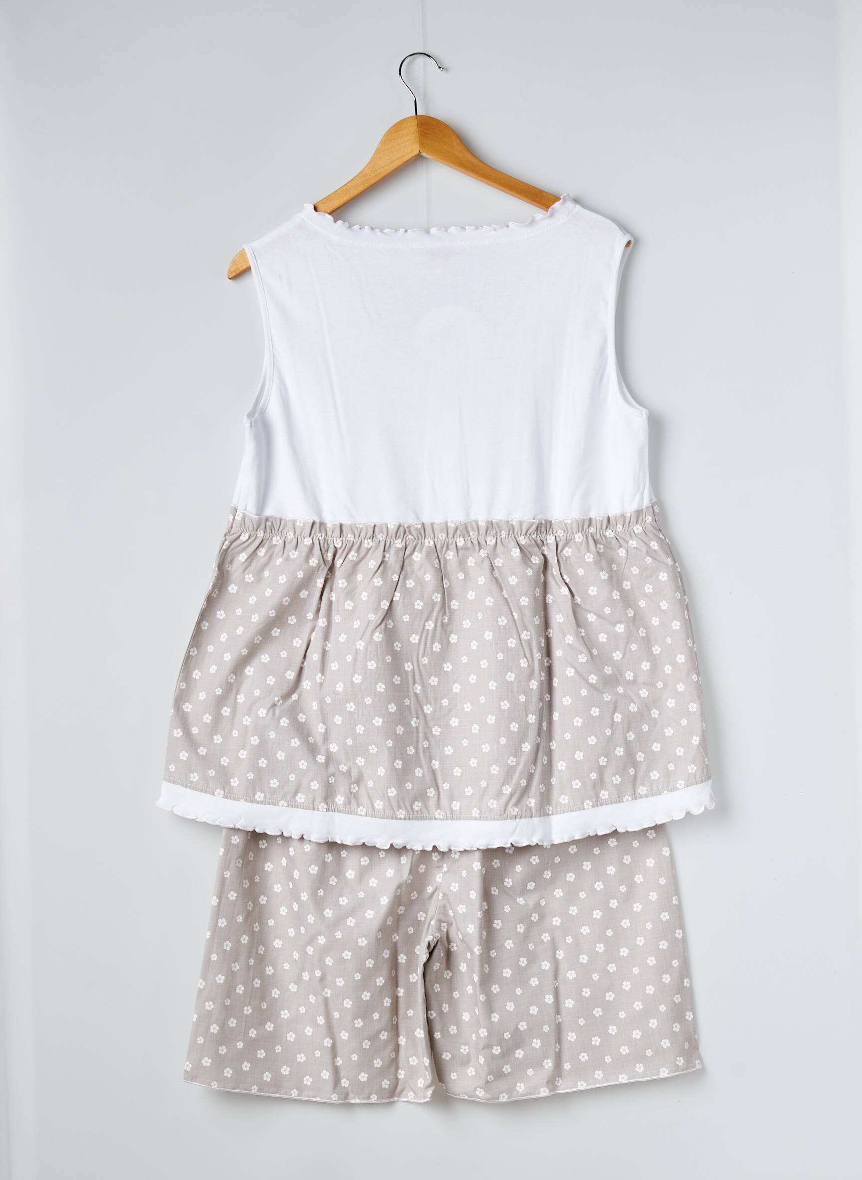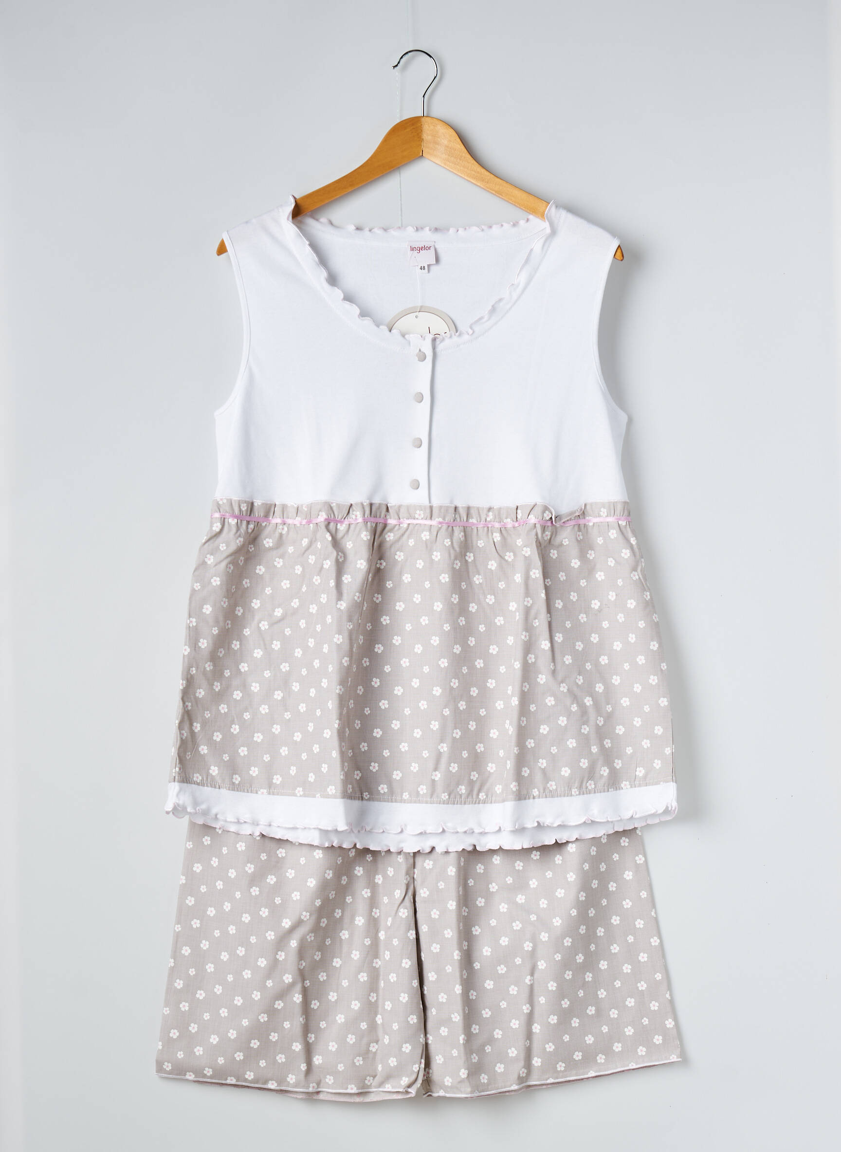 Offrez-vous une douceur irrésistible à petit prix avec ce pyjama femme de la marque LINGELOR, parfait pour profiter de nuits paisibles tout en réalisant des économies. Son haut sans manches blanc orné d’élégantes petites boutons, accompagné d’une touche de dentelle subtile à l’encolure, se marie harmonieusement avec un short fluide à pois dans des tons beiges très doux pour un rendu chic et confortable. C’est la promesse d’un look plein de tendresse et de confort, à un tarif malin pour se faire plaisir sans se ruiner.