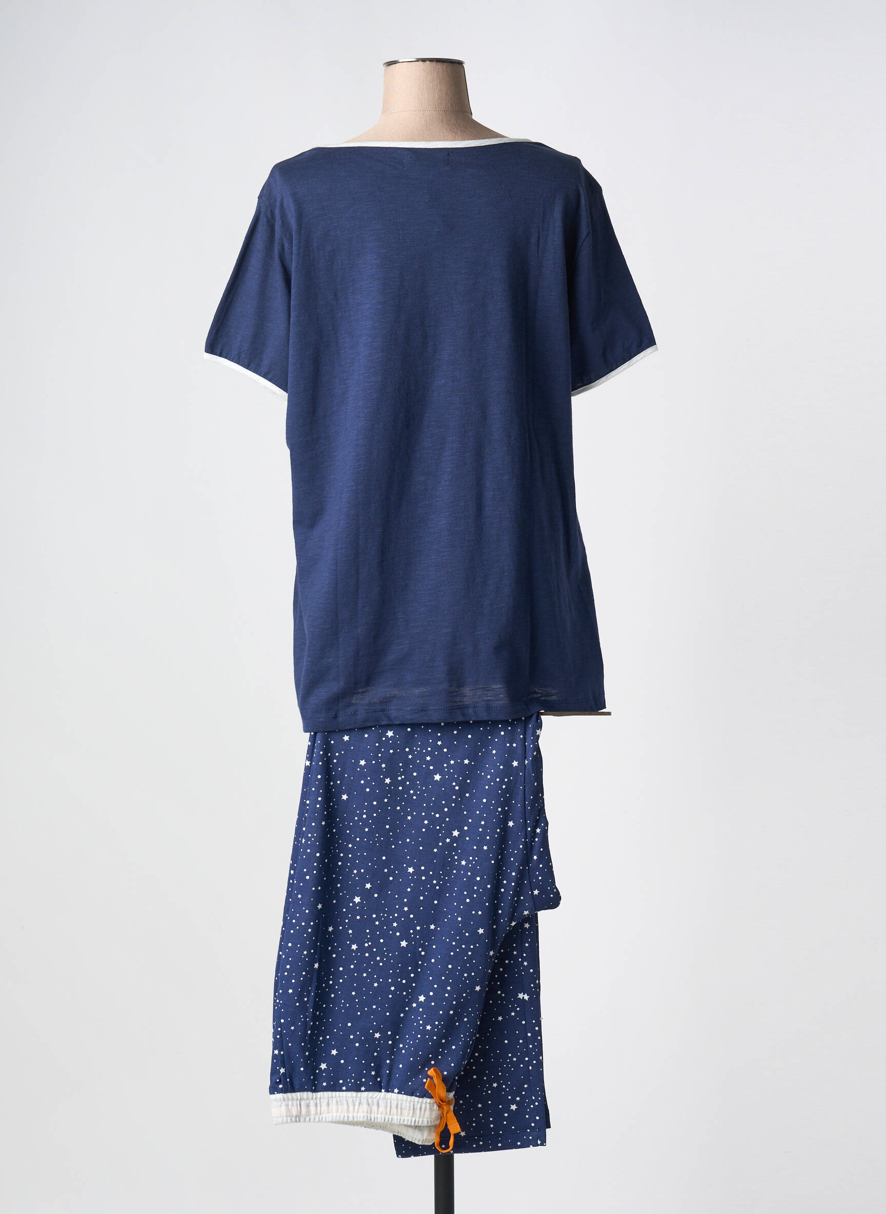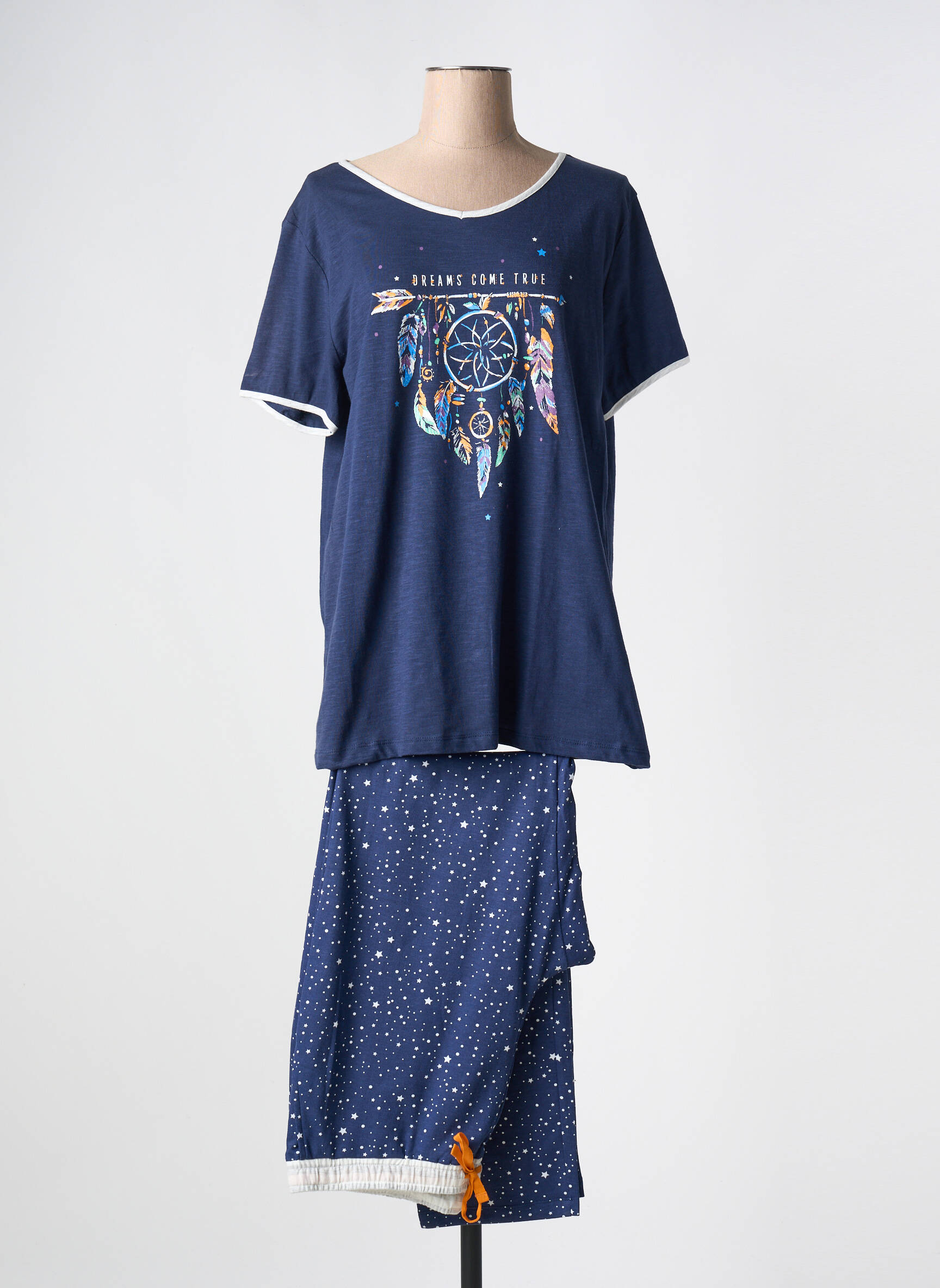 Profitez d’un véritable bon plan avec ce pyjama pour femme de la marque MASSANA, idéal pour allier confort et style à petit prix. Le haut bleu à manches courtes séduit par son joli motif attrape-rêves coloré au centre, ajoutant une touche de fantaisie à vos soirées cocooning. Le pantalon assorti, dans un bleu étoilé et rehaussé d’un cordon orange vif, complète ce duo avec modernité et douceur. Ce pyjama plein de charme vous permet de vous faire plaisir sans vous ruiner, parfait pour celles qui recherchent la qualité au meilleur prix.