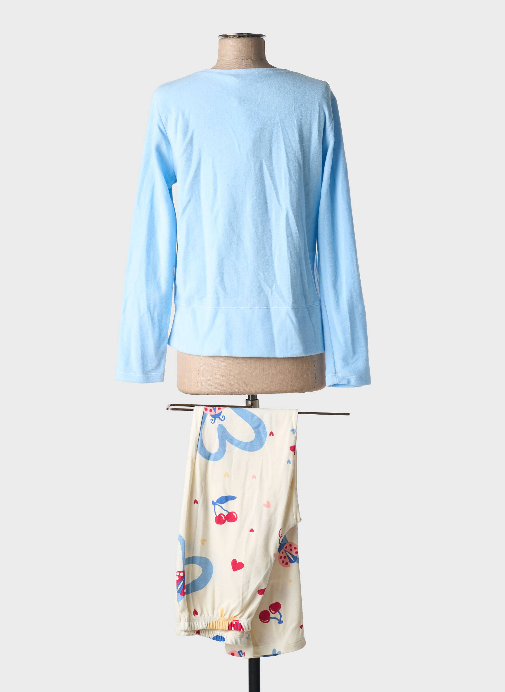 Profitez d’un vrai bon plan avec ce pyjama femme de la marque MASSANA, composé d’un haut à manches longues bleu ciel orné d’un joli message et de papillons imprimés, coordonné à un pantalon crème décoré de grands motifs papillons bleu et de petits cœurs rouges pour une touche féminine et joyeuse ; une pièce idéale pour des nuits confortables sans se ruiner, parfaite pour celles qui veulent allier douceur, style et petit prix.