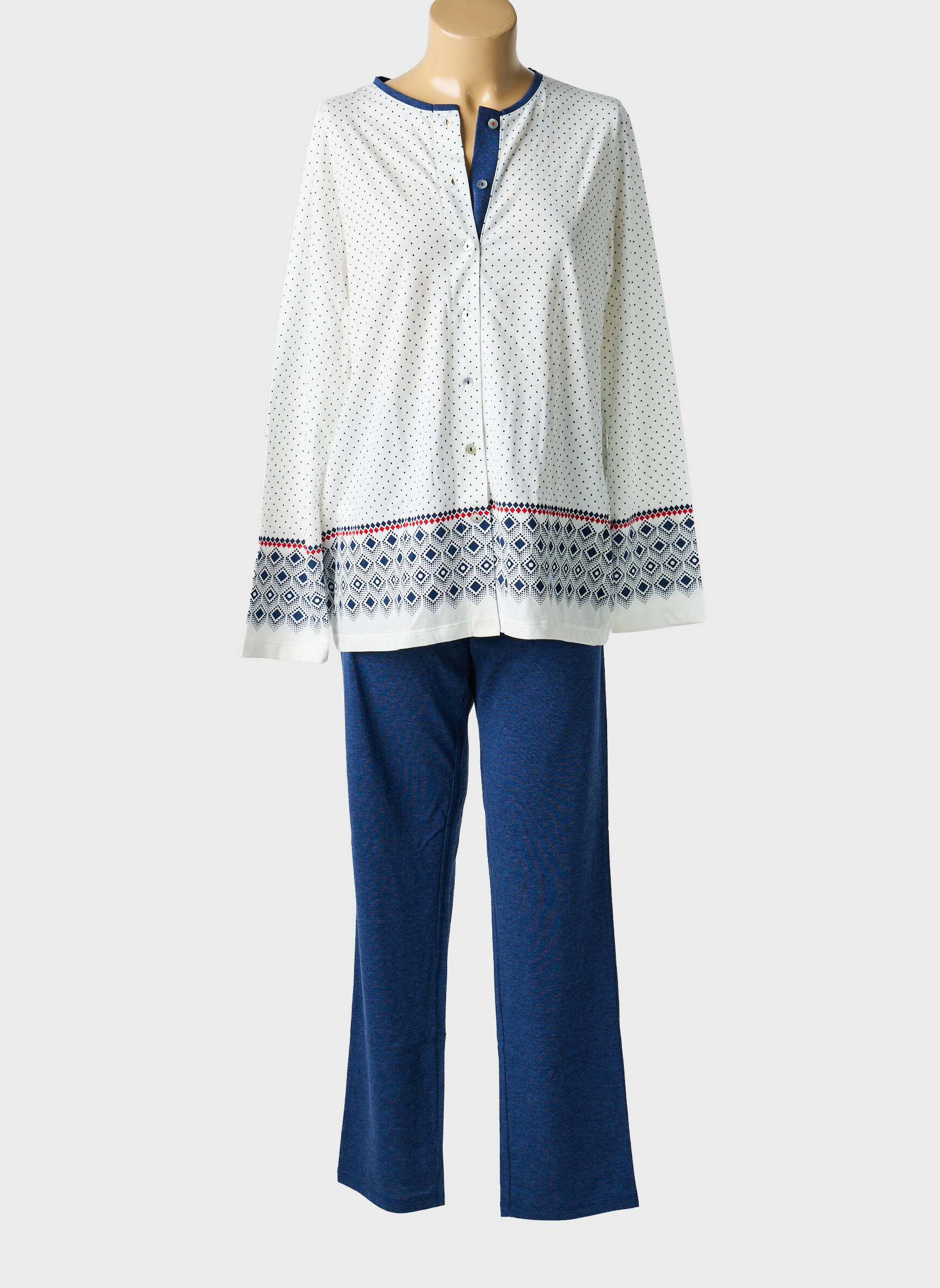 Profitez d’un vrai bon plan avec ce pyjama pour femme signé MASSANA, qui allie confort et élégance à petit prix. On aime sa veste longue boutonnée au motif délicat, rehaussée de touches graphiques discrètes et d’une bordure ornée d’une frise tendance, associée à un pantalon bleu uni pour un ensemble aussi doux que raffiné. C’est le choix parfait pour des nuits paisibles sans se ruiner !