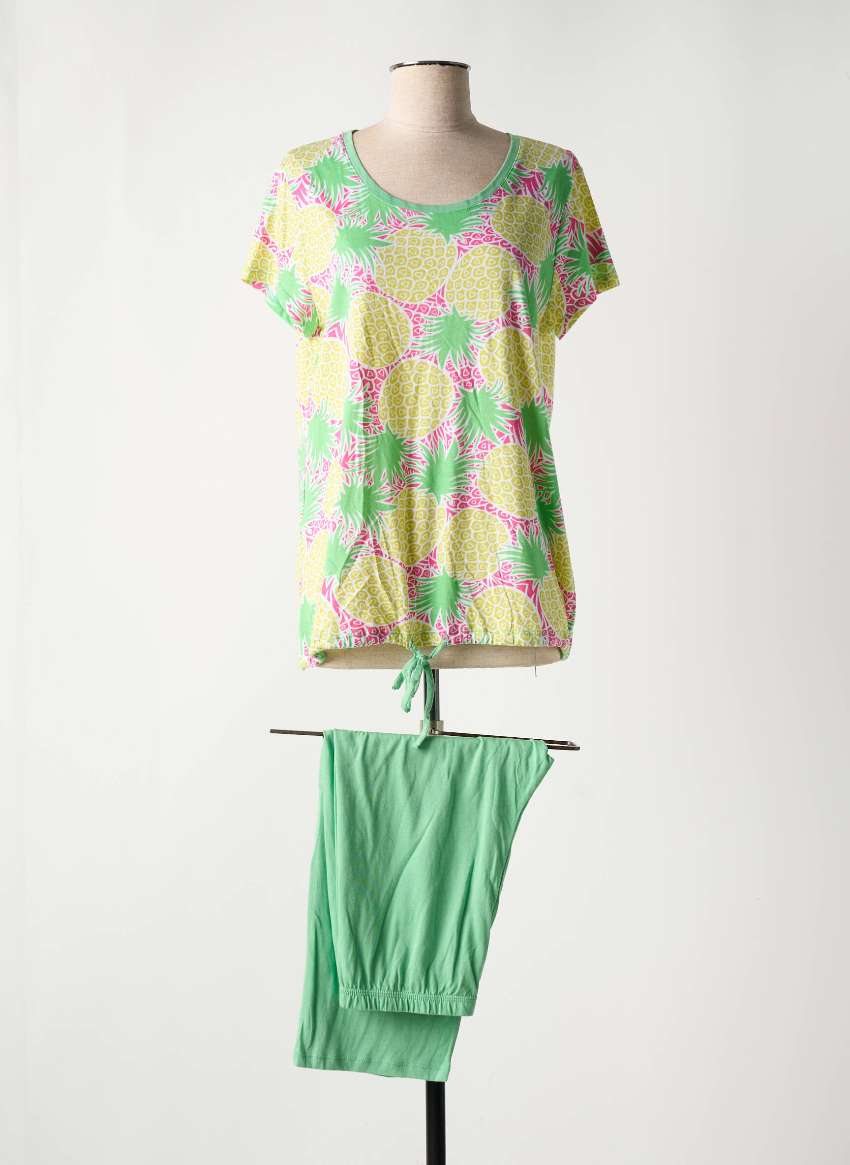 Craquez pour ce pyjama femme de la marque MASSANA, une véritable affaire à ne pas manquer pour allier confort et style sans se ruiner. Le haut coloré séduit par son imprimé lumineux aux touches jaunes, roses et vertes, tandis que le pantalon vert uni apporte douceur et simplicité à l’ensemble. Profitez d’un pyjama tendance à petit prix, parfait pour les nuits douces comme pour les matinées cocooning !