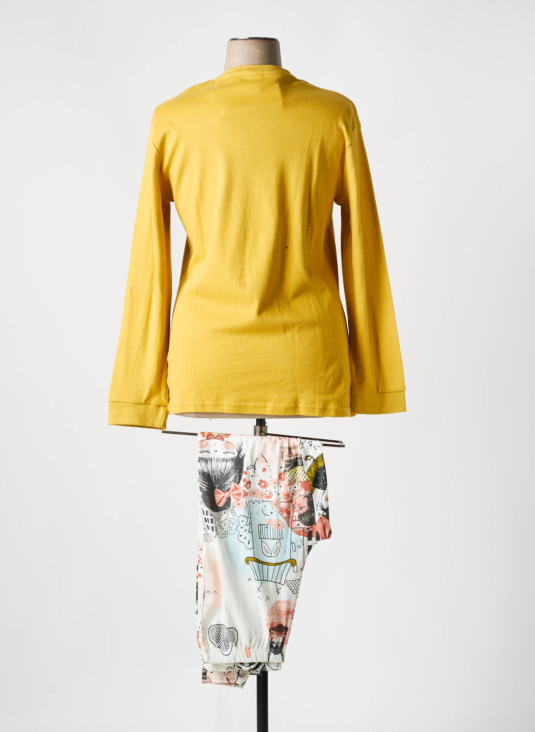 Osez l’évasion dès le coucher avec ce pyjama MUSLHER qui habille la nuit d’une douceur ludique et colorée, où un haut moutarde à manches longues se pare d’un charmant dessin enfantin aux tons roses et noirs tandis que le pantalon gris clair dévoile un imprimé fantaisiste, mêlant motifs graphiques et touches de couleur pour inviter au rêve avec originalité.