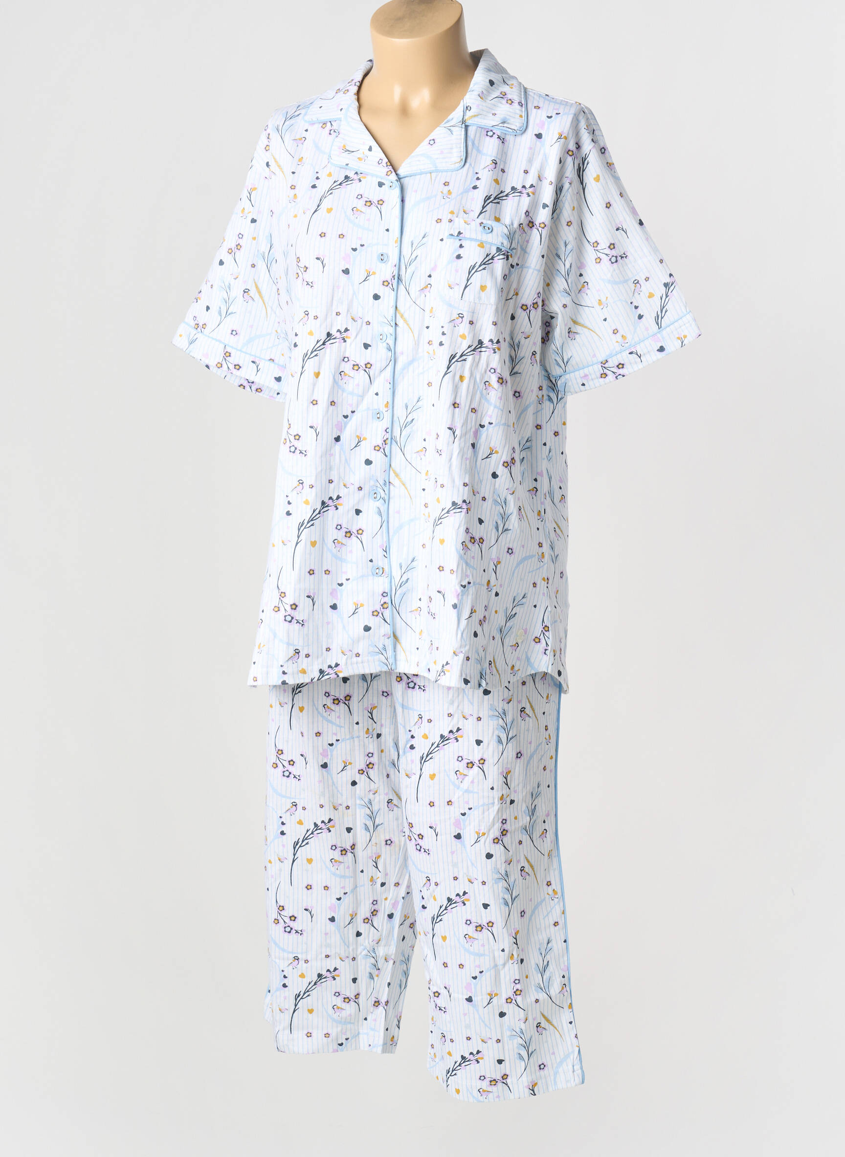 Profitez d’un vrai bon plan avec ce pyjama PASTUNETTE pour femme, à petit prix, parfait pour allier confort et élégance à la maison. Ce modèle aux manches courtes affiche une coupe classique très agréable à porter, sublimée par un motif fleuri délicat sur fond bleu clair qui apporte douceur et fraîcheur à votre garde-robe de nuit. Doté d’un col à revers et de boutons sur le devant, il est idéal pour celles qui cherchent un pyjama raffiné sans se ruiner, à adopter pour vos moments de détente.