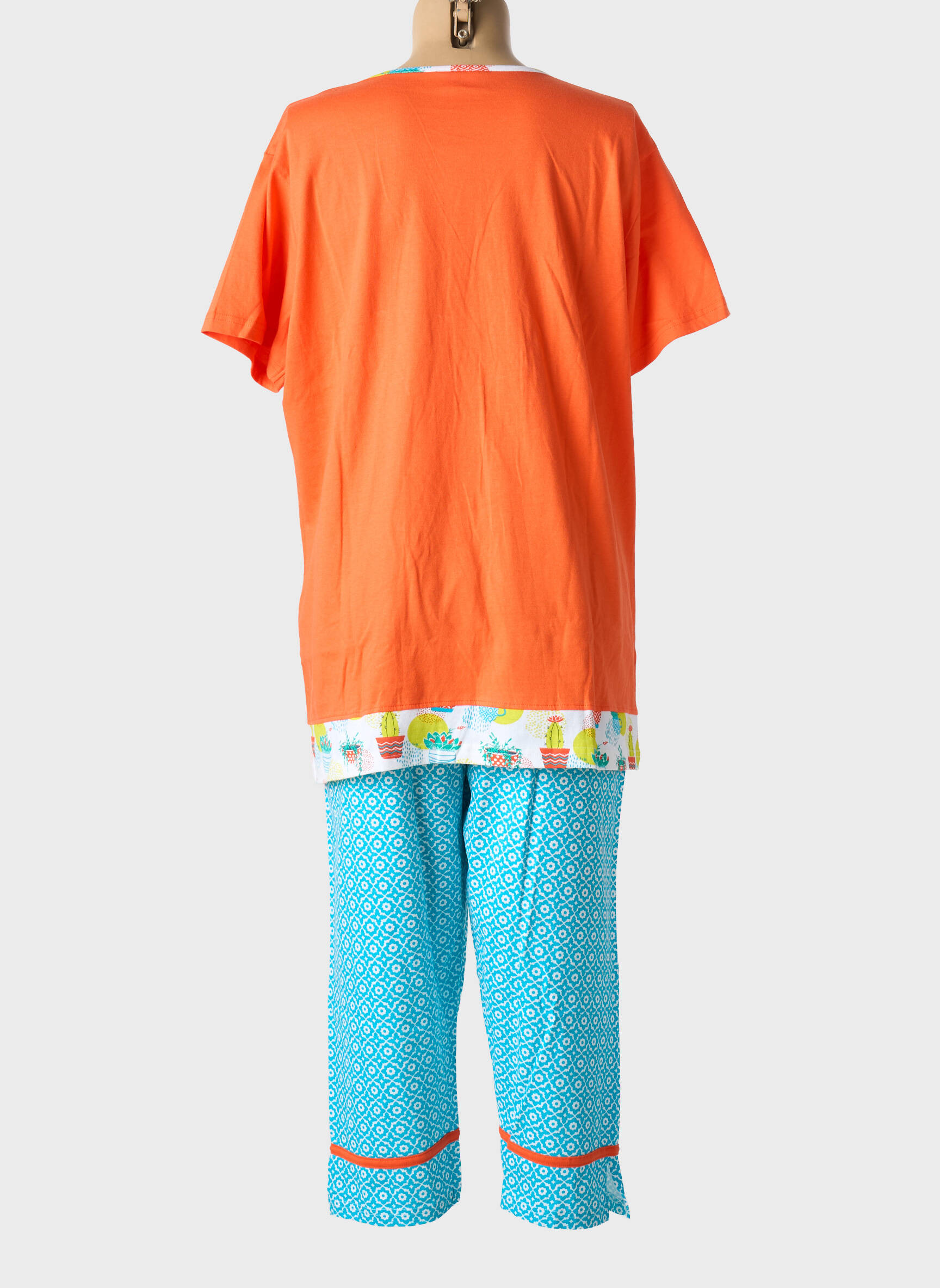 Craquez pour ce pyjama femme ROSE POMME à petit prix, une véritable bonne affaire qui apporte une note de fraîcheur et de bonne humeur à vos soirées. Le haut orange vif se distingue par un col fendu orné d’un délicat liseré imprimé, tandis que de jolis motifs cactus sur le devant ajoutent une touche ludique et originale. Le détail imprimé multicolore sur la base du haut rappelle parfaitement le pantalon à la coupe droite, habillé d’un motif graphique bleu rehaussé d’une bande orange au bas, pour un ensemble harmonieux et tendance. Profitez du confort tout en réalisant une véritable économie avec ce pyjama pratique et plein de pep’s.