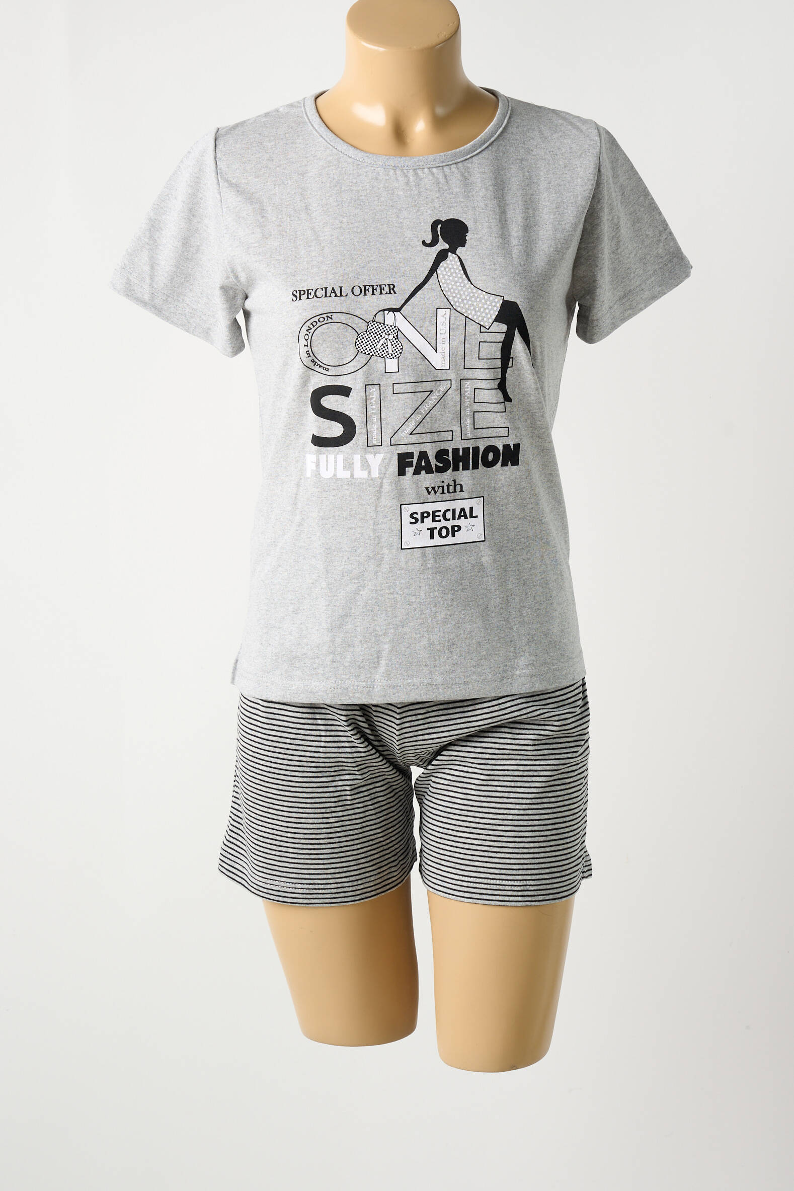 Craquez pour ce pyjashorts de la marque EVEN pour femme, une opportunité à prix mini pour allier style et confort sans vous ruiner. Son tee-shirt gris orné d’un imprimé graphique mode et son short à fines rayures invitent à la détente tout en affichant une touche tendance, parfait pour profiter de nuits douces et stylées sans dépasser votre budget.