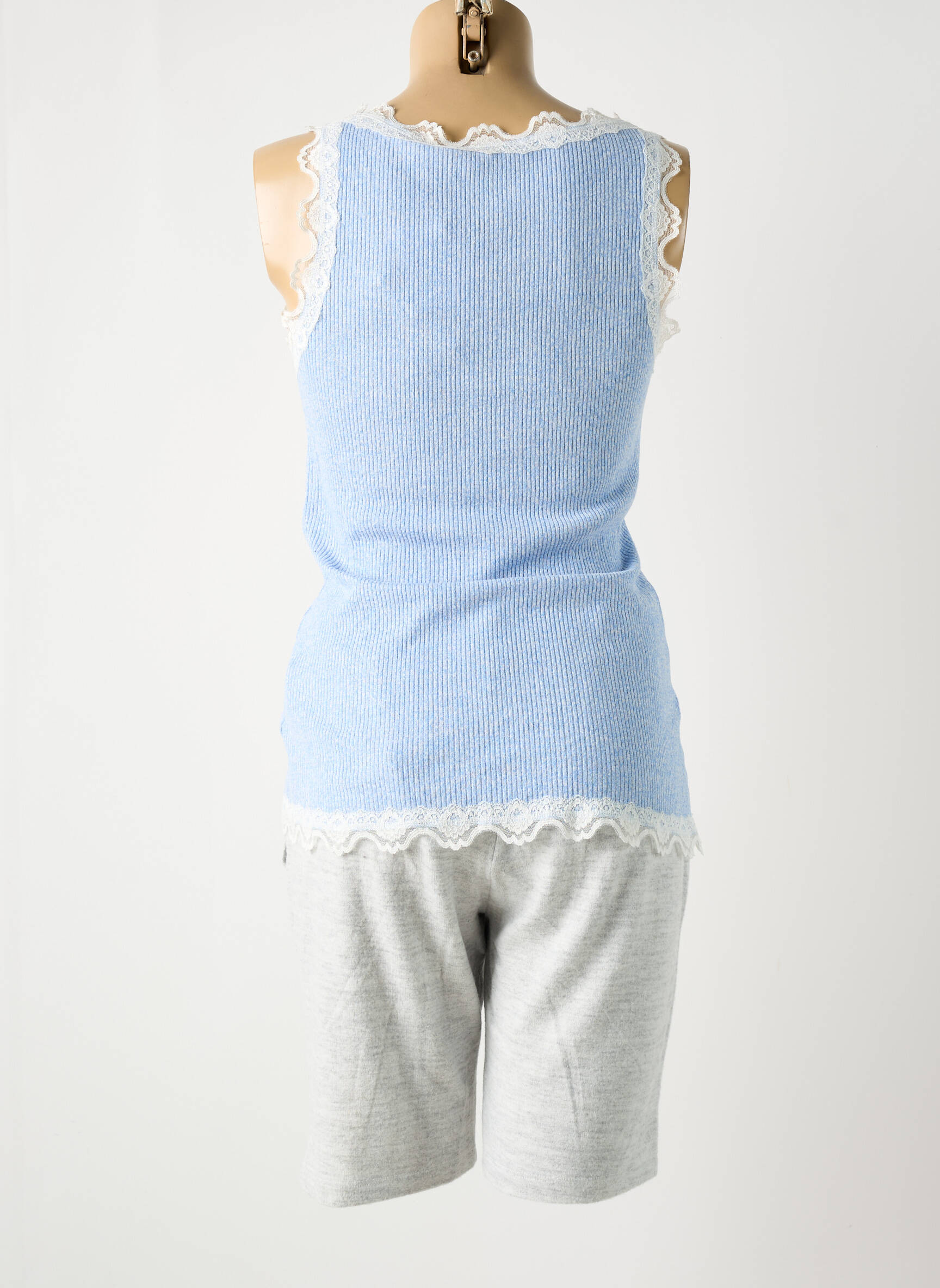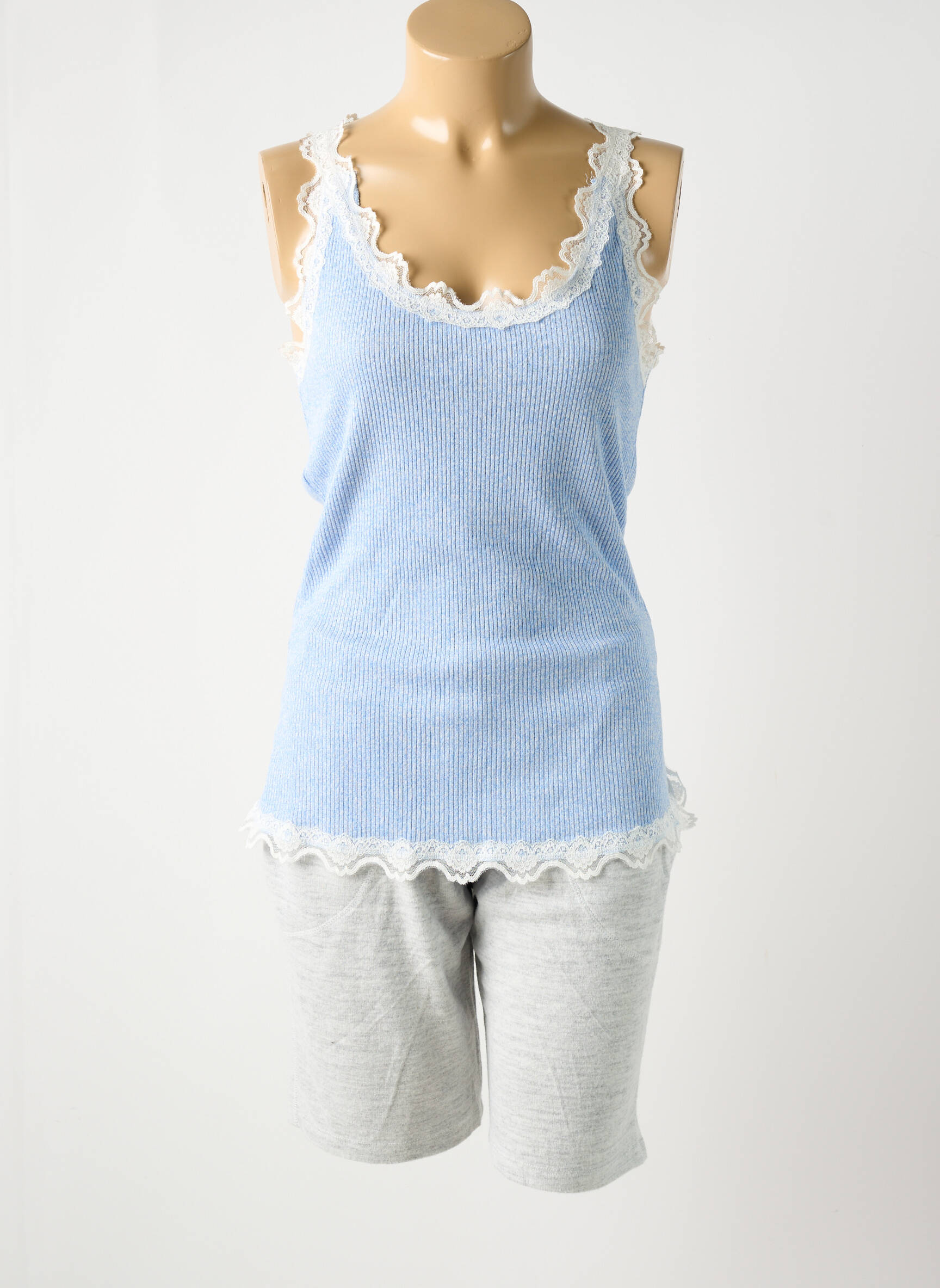 Profitez d’un pyjashorts femme de la marque RINGELLA à prix mini, parfait pour vous offrir douceur et confort sans vous ruiner. Ce modèle allie un débardeur bleu ciel orné de délicates finitions festonnées en dentelle blanche au niveau du col, des emmanchures et de la base, à un short gris clair à la coupe décontractée. Sa matière douce et légère promet de belles nuits tout en apportant une touche féminine grâce à ses jolis détails, pour un look cosy accessible à toutes.