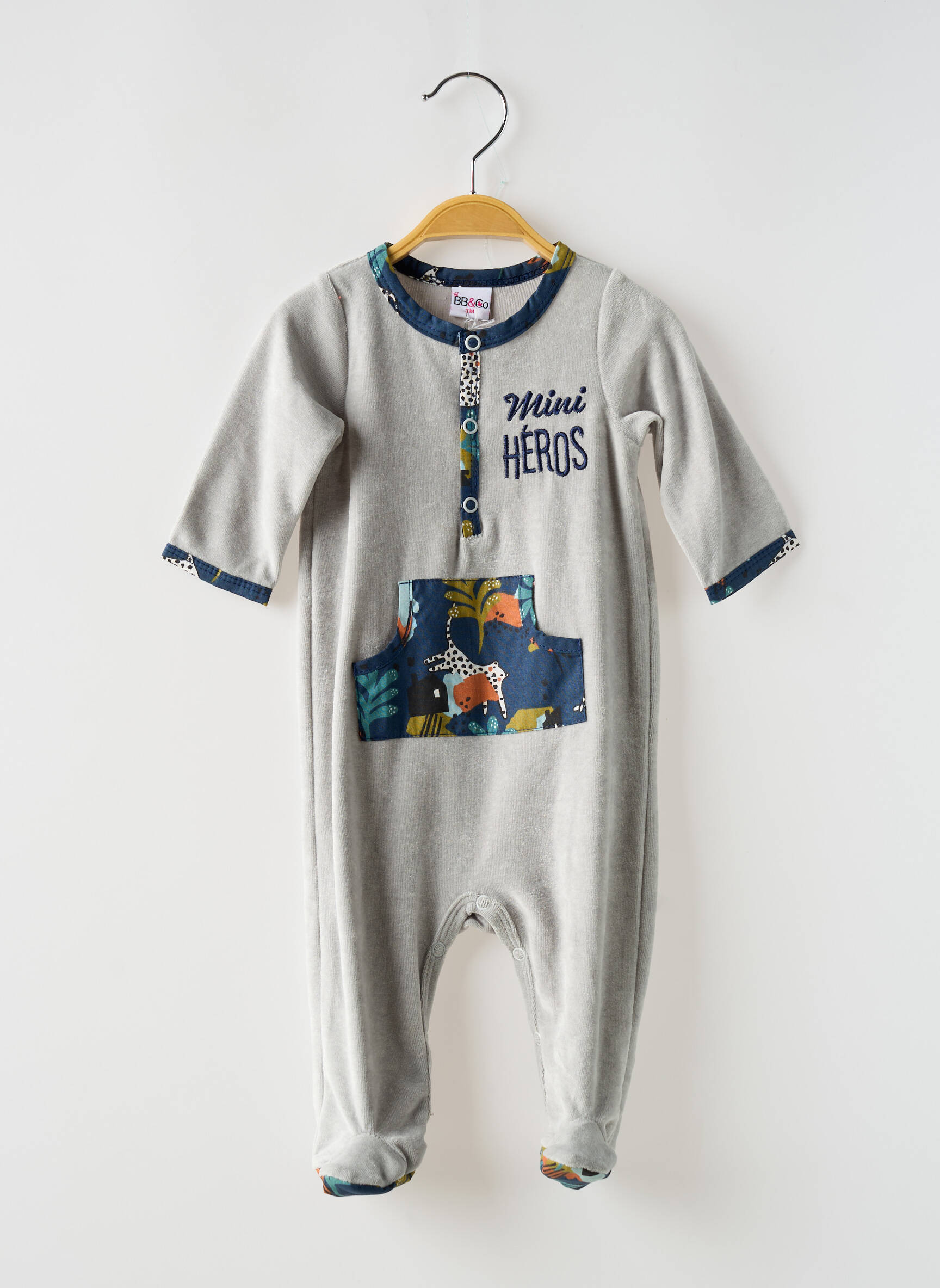 Ce pyjama garçon BB AND CO est le bon plan à ne pas manquer pour offrir douceur et originalité à petit prix. Avec son joli coloris gris, sa poche kangourou imprimée animaux colorés et son inscription « Mini Héros » sur la poitrine, il allie confort et style pour accompagner les nuits de votre enfant sans se ruiner.
