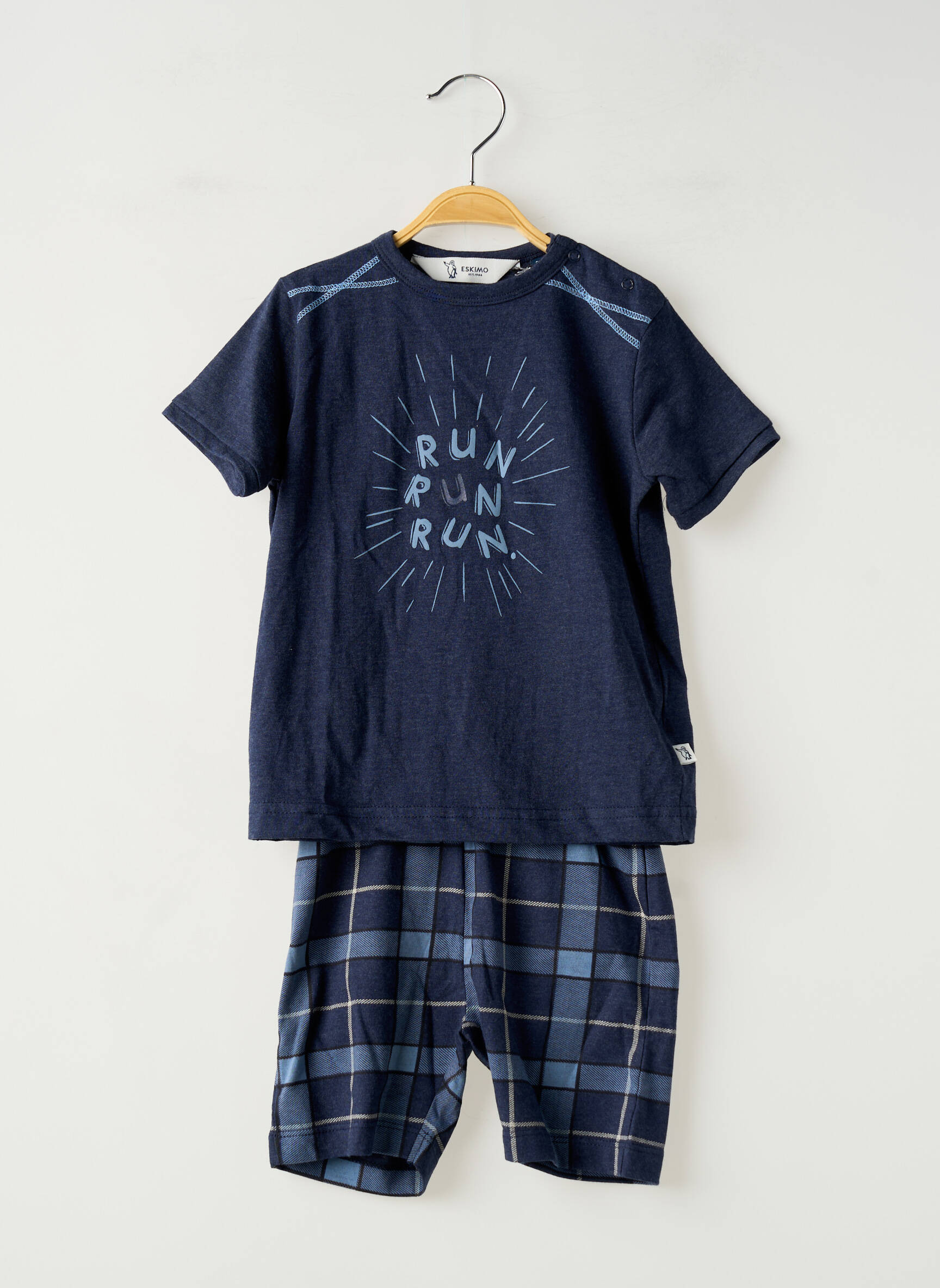 Pour offrir à votre garçon un sommeil confortable sans vous ruiner, ce pyjama ESKIMO est le bon plan à ne pas manquer. Composé d’un t-shirt bleu marine à l’imprimé dynamique « RUN RUN RUN » et d’un short à carreaux dans les tons bleus, il allie style moderne et esprit sport pour accompagner les nuits comme les moments de détente à la maison. Une occasion idéale de faire plaisir à petit prix avec une pièce tendance et pleine d’énergie !