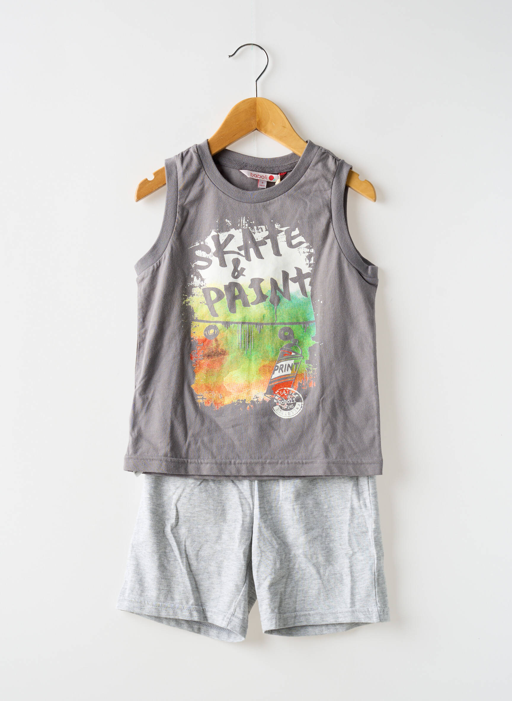 Voici une super affaire à ne pas manquer avec ce pyjashorts garçon signé BOBOLI, composé d’un débardeur gris orné d’un motif coloré tendance façon street art et d’un short assorti, parfait pour les nuits d'été ou les moments de détente à la maison, à prix mini pour allier style et économies au quotidien.
