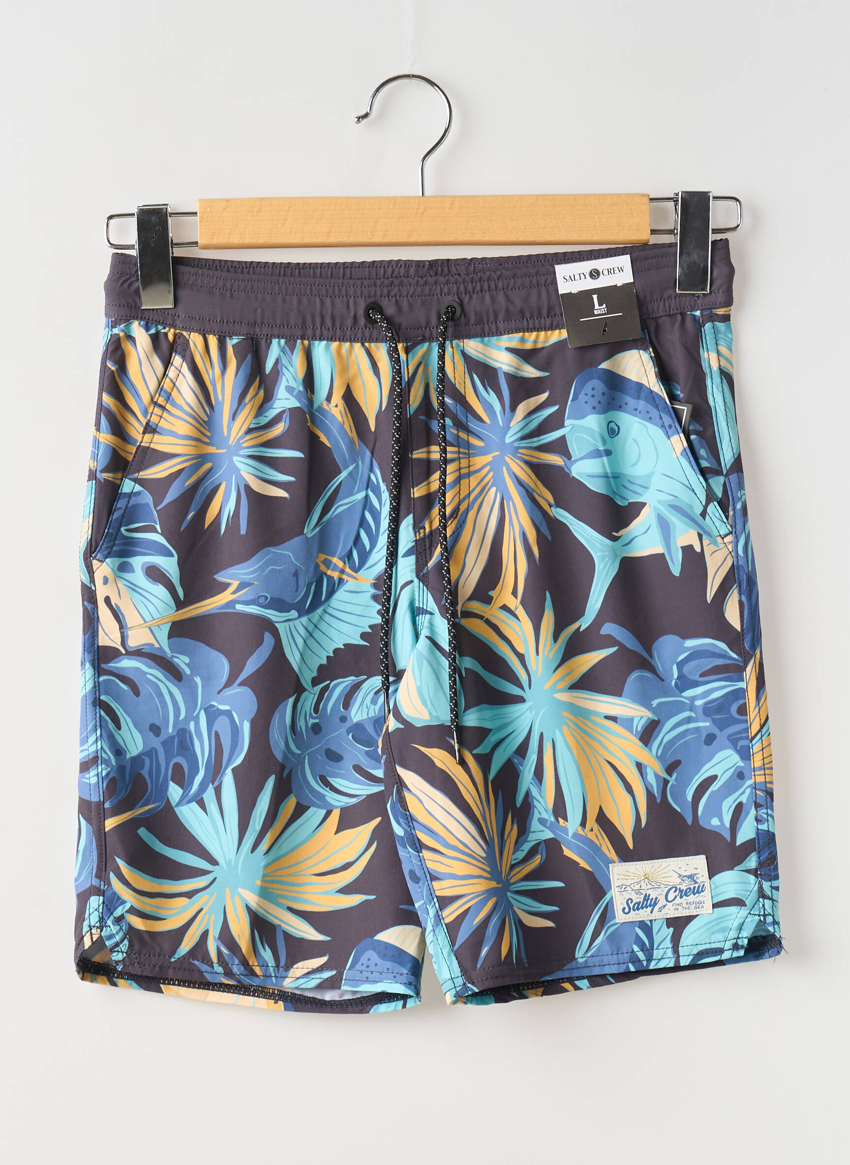 Profitez d’un super bon plan avec ce short de bain Salty Crew, parfait pour ceux qui veulent allier style tendance et petit prix. Son imprimé exotique aux couleurs bleu, jaune et vert met en avant un motif tropical mélangeant feuillages et poissons, idéal pour se démarquer à la plage ou à la piscine. Sa coupe confortable, sa taille élastique avec cordon de serrage et sa matière légère en font un choix futé pour vos journées d’été, tout en offrant une allure décontractée et contemporaine sans se ruiner.