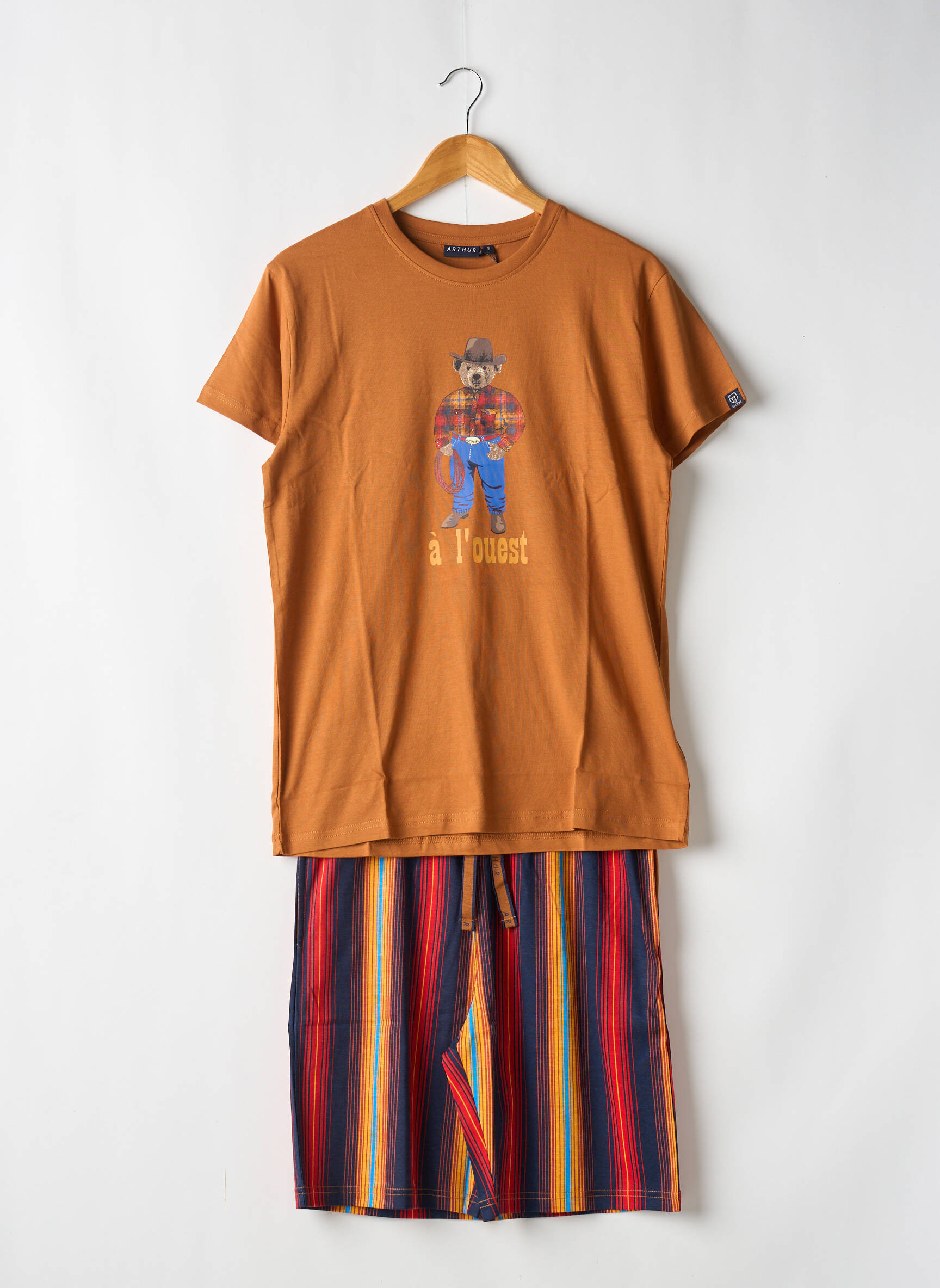 Faites-vous plaisir sans vous ruiner avec ce pyjama ARTHUR pour homme, composé d’un t-shirt à la teinte chaude orné d’un motif ours à l’ouest pour une touche d'humour et d’originalité, accompagné d’un short à rayures colorées qui dynamise vos soirées comme vos matins. Ce pyjama à petit prix garantit un confort tendance et une allure décontractée à moindre coût, idéal pour profiter de la qualité ARTHUR sans compromis sur votre budget.