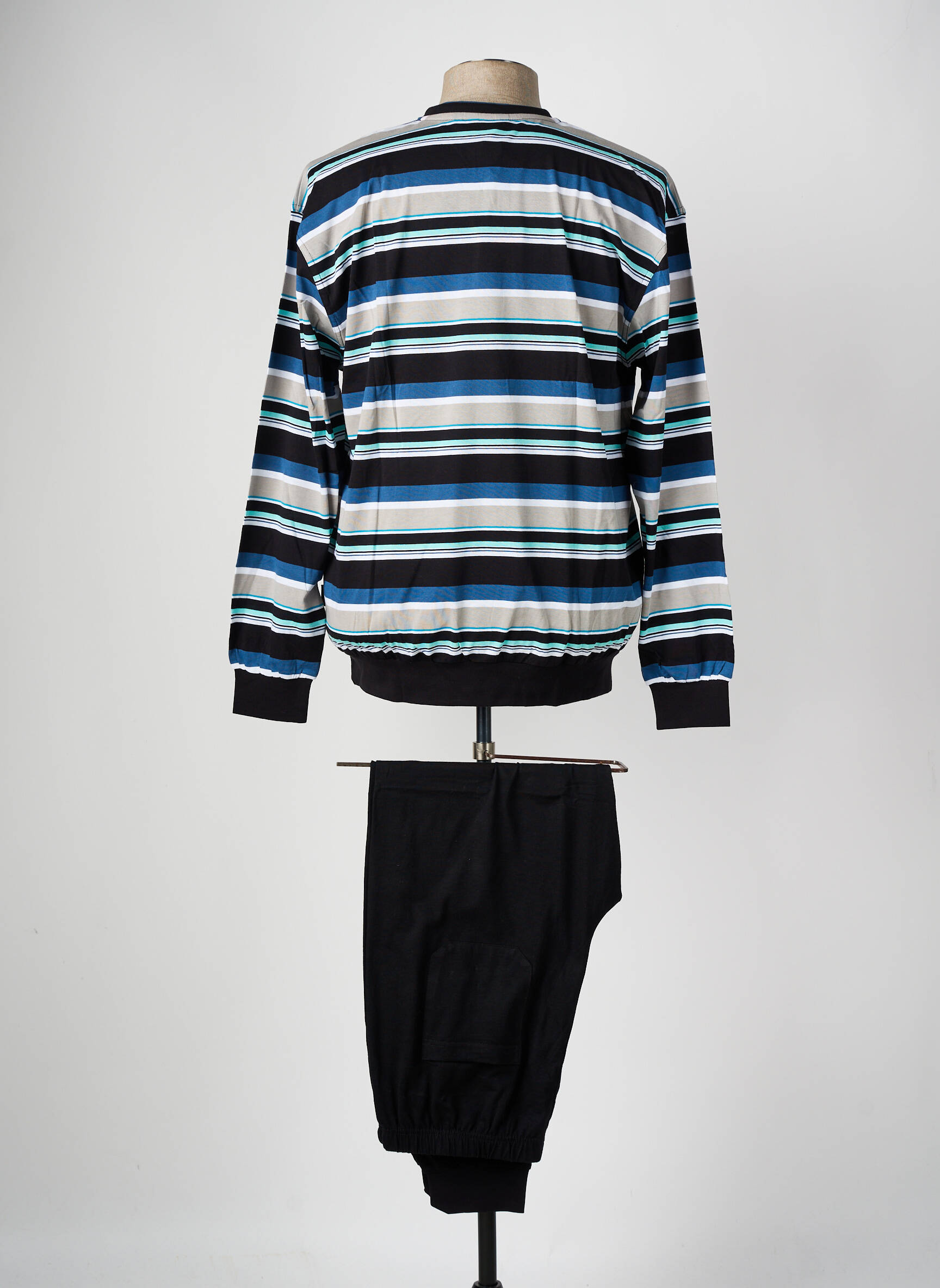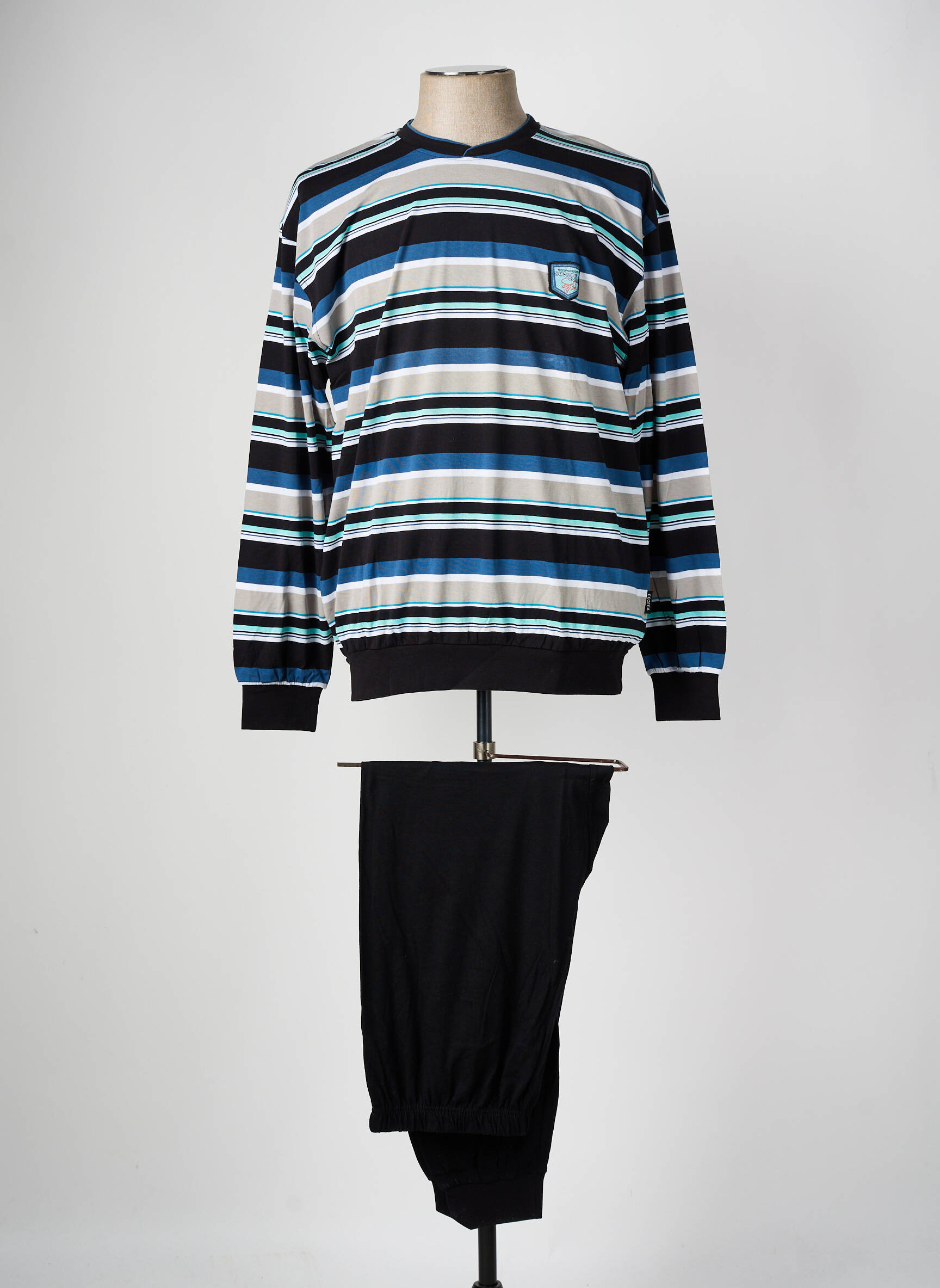 Profitez d’un bon plan confort avec ce pyjama CECEBA pour homme, parfait pour passer des nuits tout en douceur sans vous ruiner. Le haut à manches longues arbore un motif rayé moderne aux tons bleu, noir et blanc et s’accompagne d’une poche poitrine discrète, tandis que le pantalon uni noir s’ajuste idéalement à votre silhouette pour un maintien optimal. Ce pyjama est idéal pour allier style décontracté et économies sur vos essentiels de nuit.