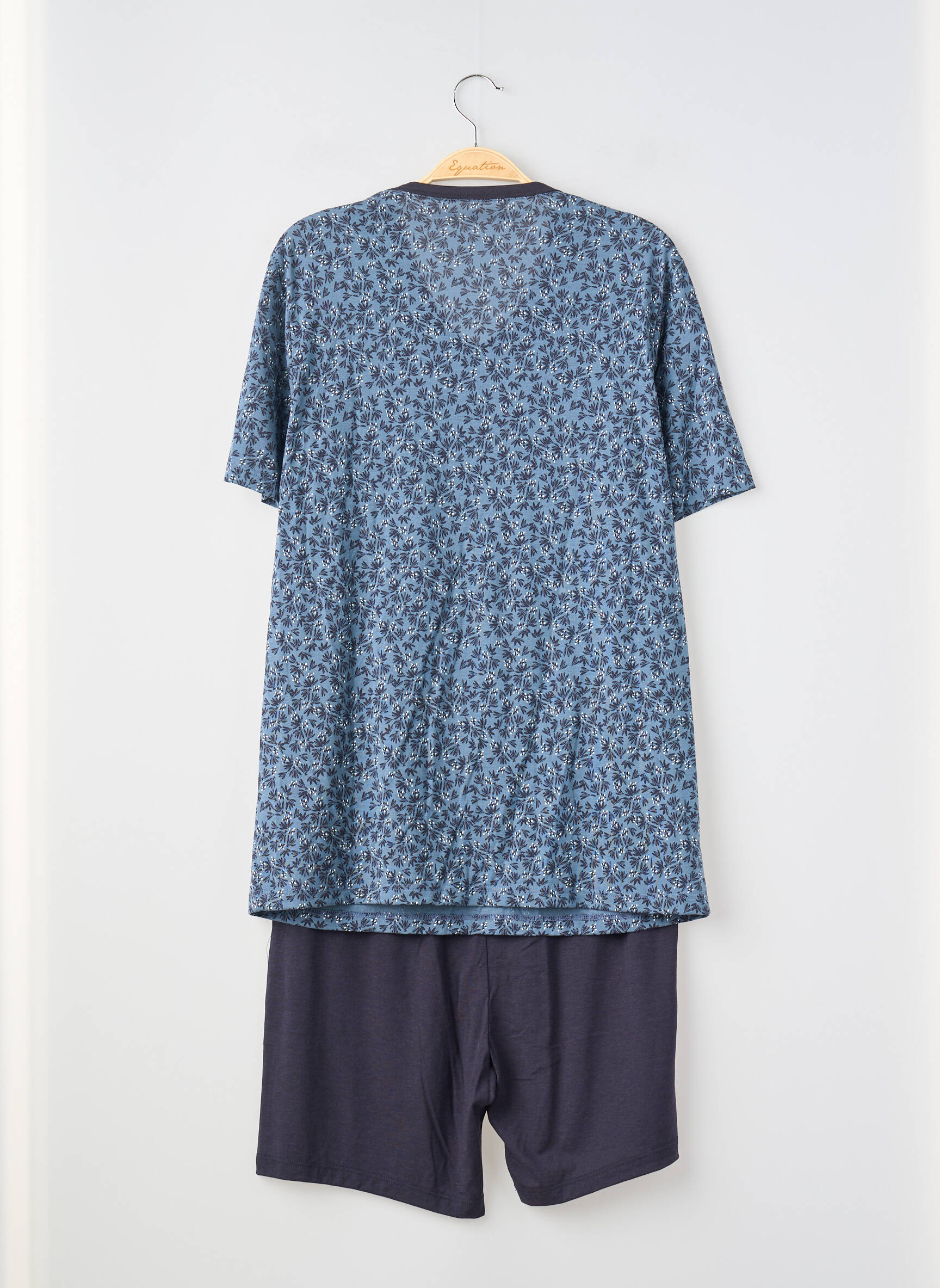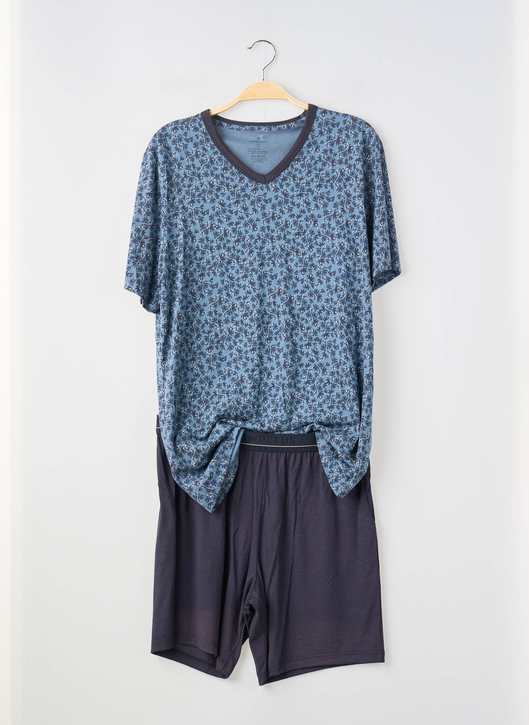Profitez d’un vrai bon plan avec ce pyjama IMPETUS pour homme, parfait pour allier confort et style à petit prix. Le haut, à manches courtes et col en V, se distingue par son imprimé discret dans des tons bleus qui apporte une touche moderne, tandis que le short uni bleu marine assure une allure élégante et décontractée. Idéal pour les nuits d’été ou les moments de détente à la maison, ce pyjama vous permet de faire des économies sans compromis sur la qualité ou le style.