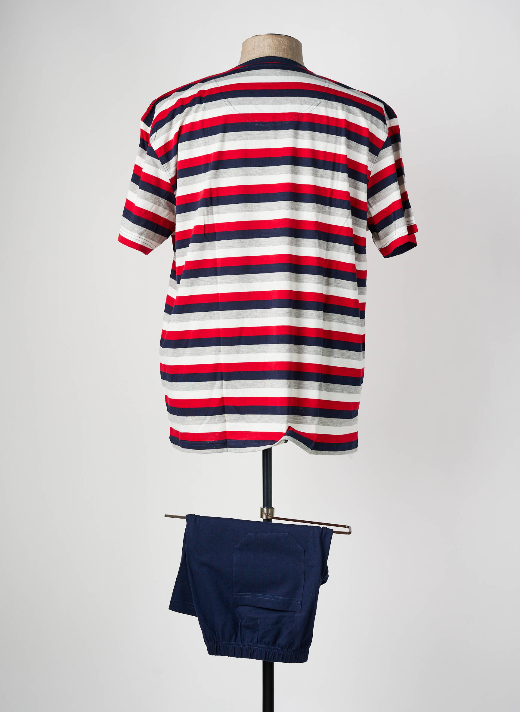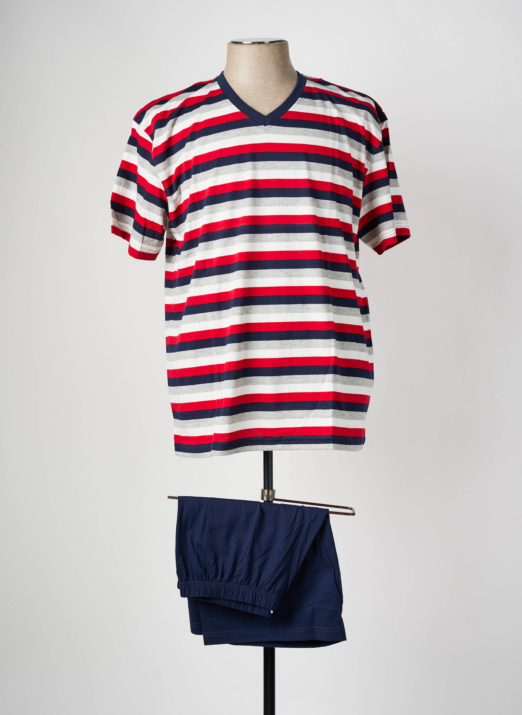 Craquez pour ce pyjashorts CECEBA pour homme, une véritable affaire à ne pas manquer pour allier confort et petit prix. Ce modèle propose un t-shirt à rayures rouges, blanches et bleues au col en V, associé à un short uni bleu marine, parfait pour passer des nuits paisibles ou se détendre à la maison. Ce pyjashorts allie style moderne et simplicité, idéal pour profiter d’un moment de détente sans se ruiner.