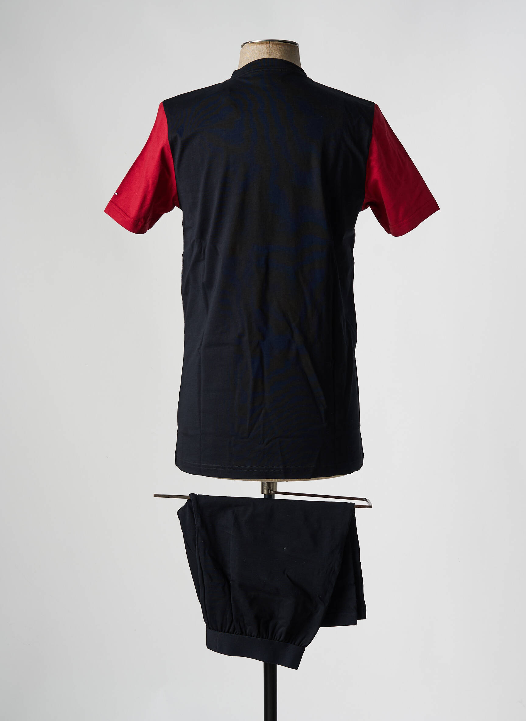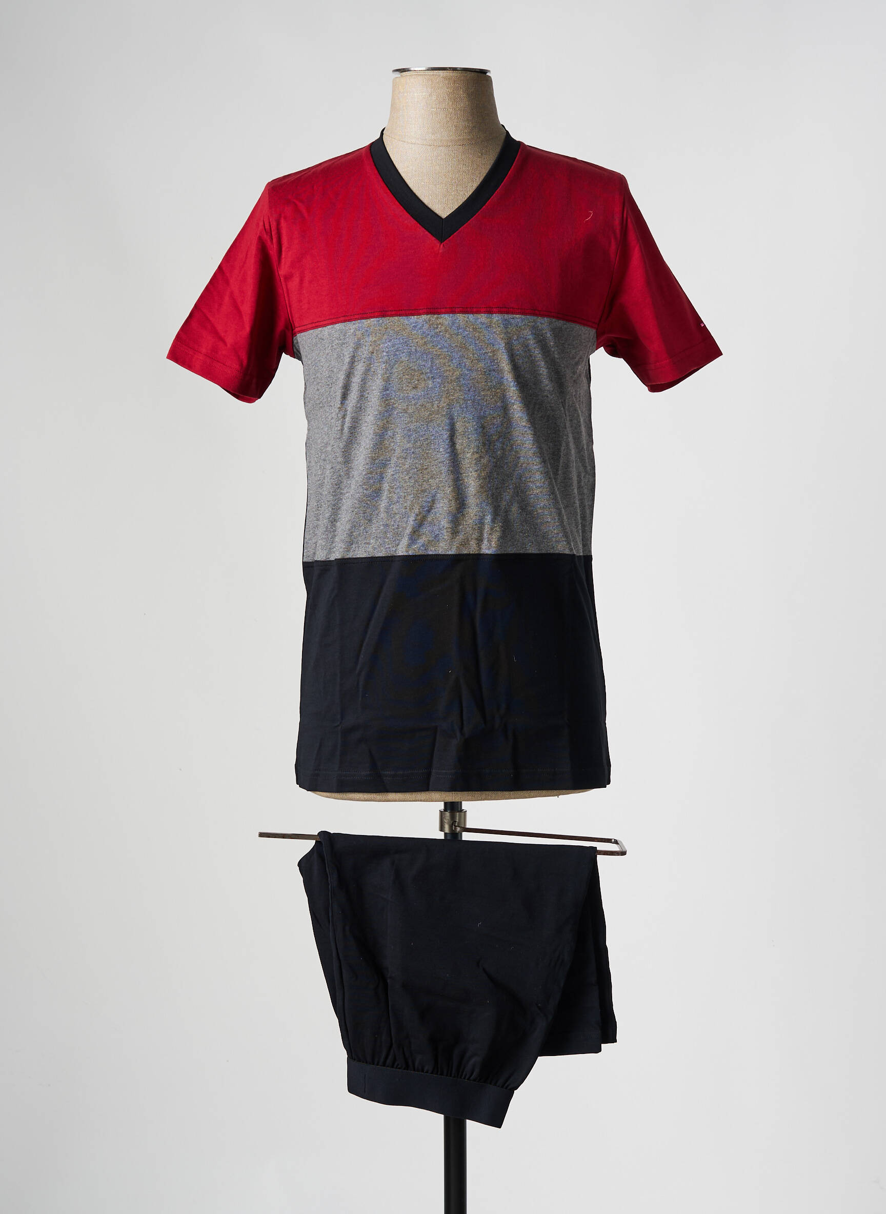 Profitez d’un pyjashorts Eden Park pour homme à prix mini, idéal pour allier confort et style à la maison sans se ruiner. Ce modèle se distingue par son t-shirt à manches courtes à l’encolure en V, proposant un jeu de couleurs moderne avec un haut rouge vif, une bande centrale grise et une base noire, ainsi qu’un short assorti noir très facile à porter. Optez pour ce bon plan et offrez-vous la qualité d’une grande marque à prix déstocké.