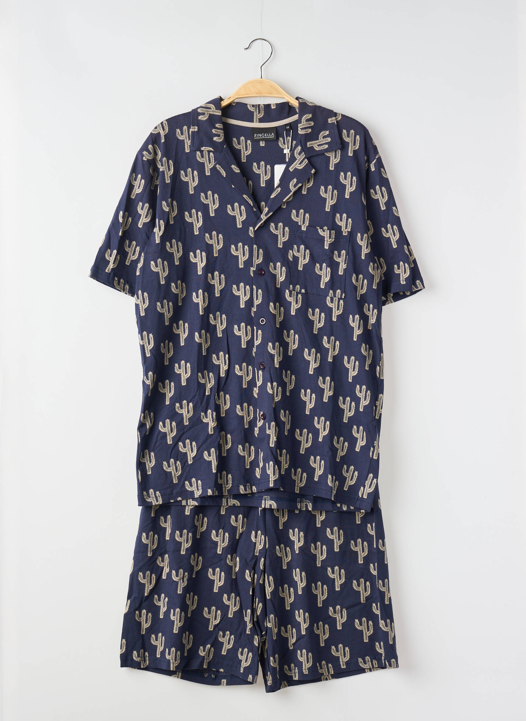Offrez-vous un sommeil stylé sans vous ruiner avec ce pyjashorts homme de la marque Ringella à prix mini, arborant un motif cactus original sur fond bleu marine pour une touche de fun et de fraîcheur à la maison. Ce deux-pièces au look tendance combine une chemise à manches courtes boutonnée et un short assorti, parfait pour les nuits d’été ou les moments de détente à petit prix.
