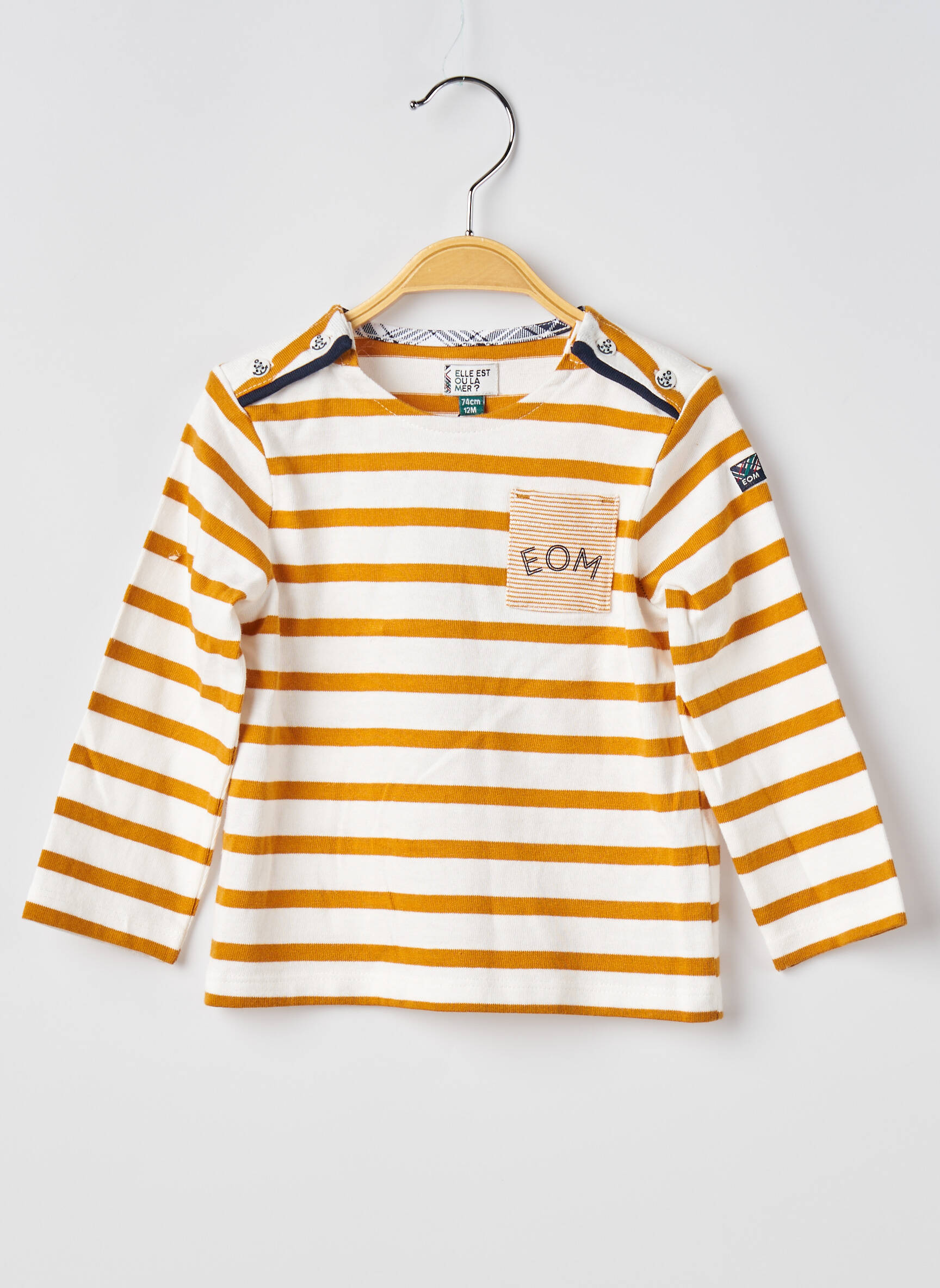 On pourrait croire que les rayures racontent une histoire de plage ensoleillée, et ce T-shirt à manches longues pour enfant d’ELLE EST OU LA MER le confirme avec son alliance de bandes larges jaunes et blanches d’une douceur évidente, rehaussé d’une petite poche beige ornée du lettrage minimaliste "EOM" qui apporte une touche de caractère tout en restant subtile.