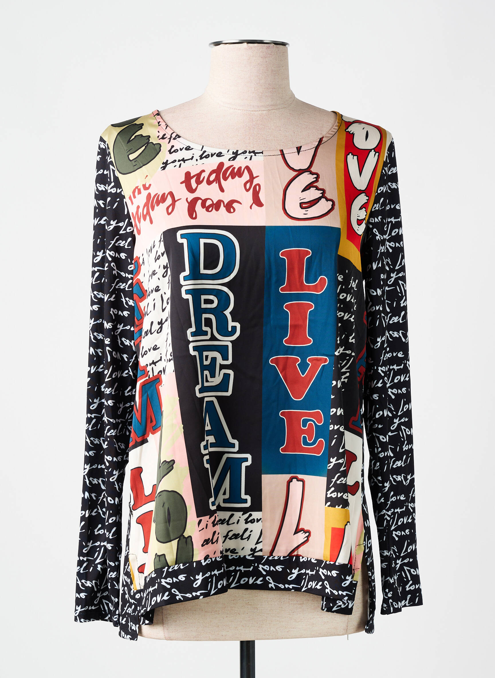 Craquez pour cette blouse femme AN II VITO à prix mini, parfaite pour ajouter une touche artistique et dynamique à votre dressing sans vous ruiner. Son design original mêle des impressions graphiques colorées et des messages positifs comme "DREAM" et "LIVE" sur le devant, tandis que les manches contrastent avec un motif manuscrit noir et blanc, pour un style unique qui attire les regards. C’est le choix idéal pour se démarquer tout en profitant d’un bon plan irrésistible.