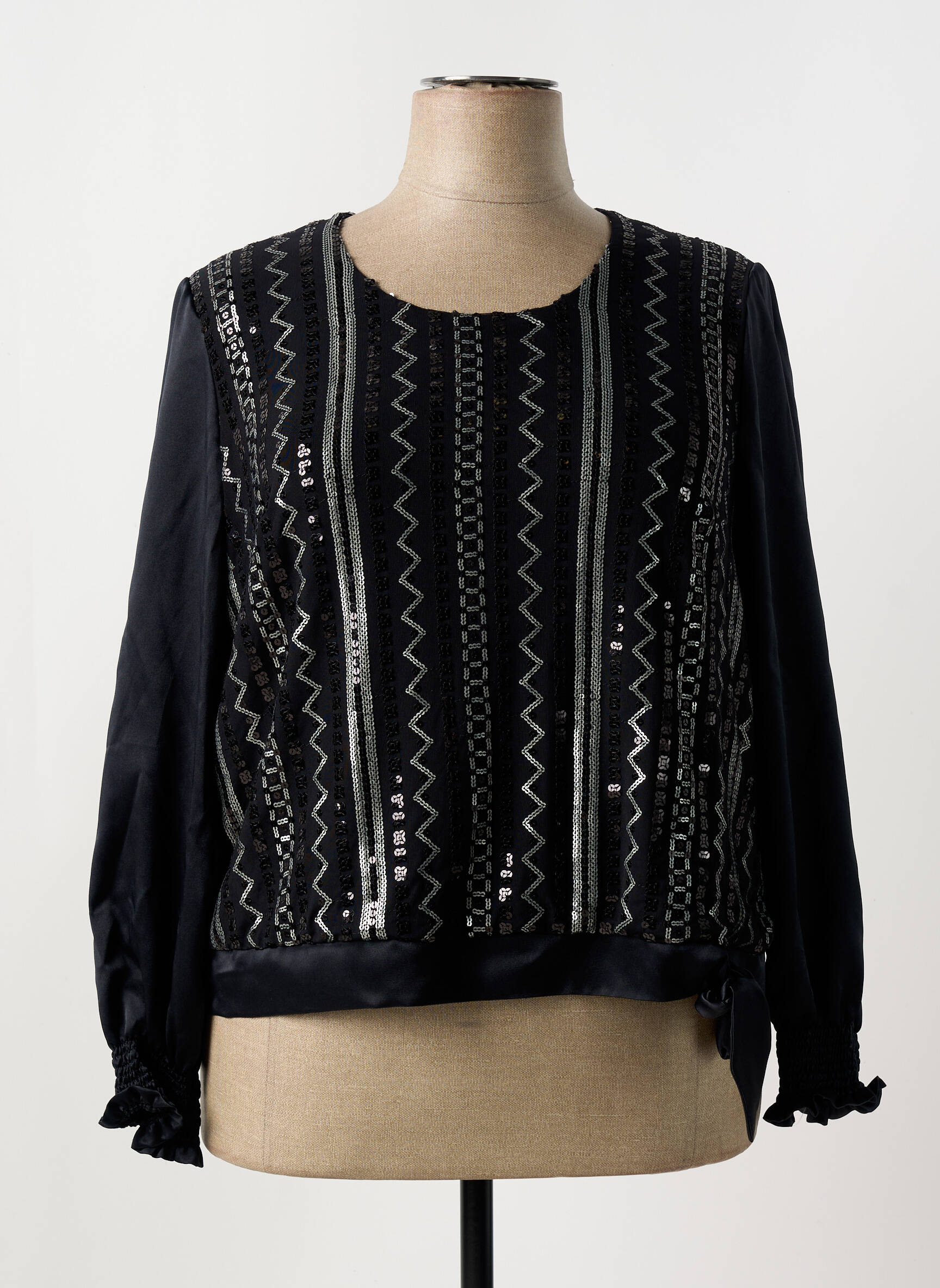 Craquez pour cette blouse ATIAN pour femme, une pièce tendance à prix mini qui conjugue élégance et bonne affaire. Sa couleur noire intemporelle est sublimée par un motif graphique à sequins argentés qui illumine subtilement l’ensemble, tandis que les manches longues fluides et les finitions froncées ajoutent une touche bohème et raffinée à votre look. Profitez de cette opportunité pour vous offrir une blouse de marque originale sans vous ruiner, idéale pour dynamiser votre dressing en toute simplicité.
