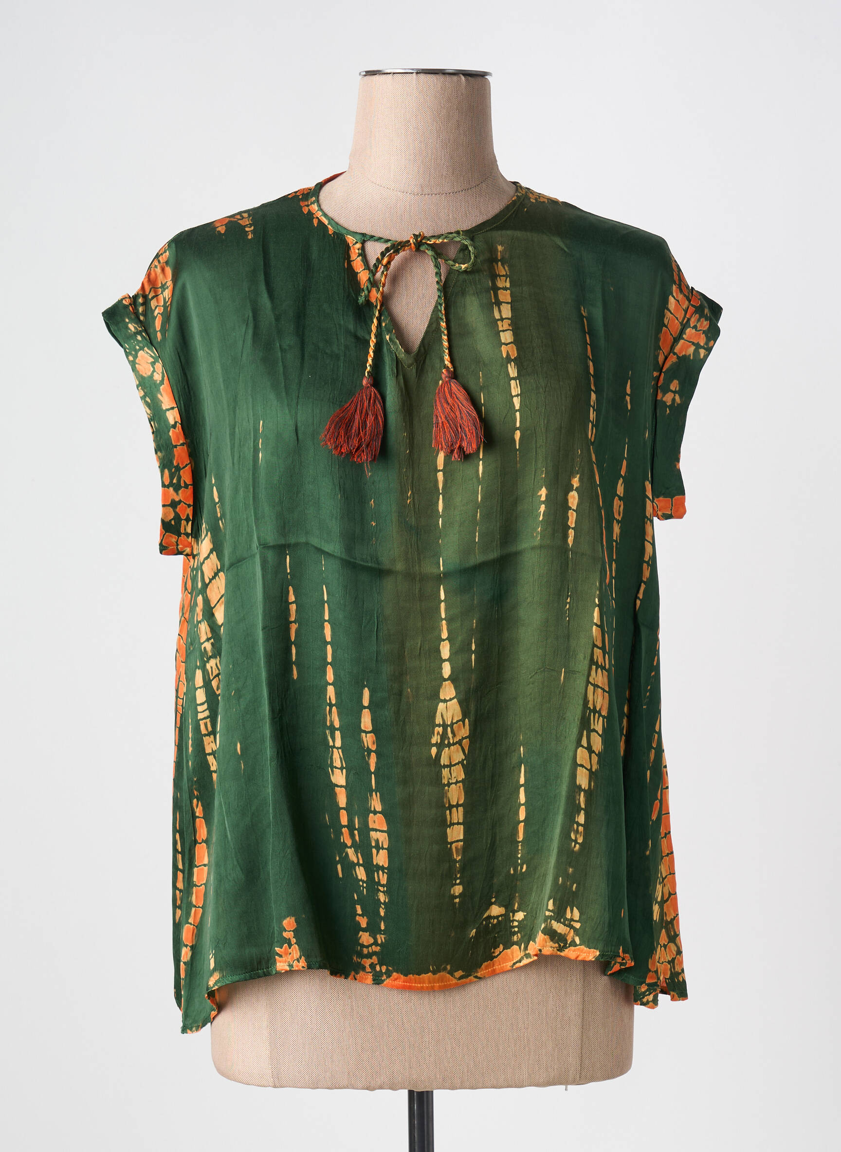 Profitez d’une belle affaire mode avec cette blouse femme BELLA JONES, dont l’imprimé tie and dye vert et orangé apporte une touche bohème et originale à votre dressing tout en restant accessible côté budget. On craque pour sa matière fluide, ses petites manches courtes et son encolure à lien avec pompons, idéale pour compléter une tenue décontractée sans se ruiner.