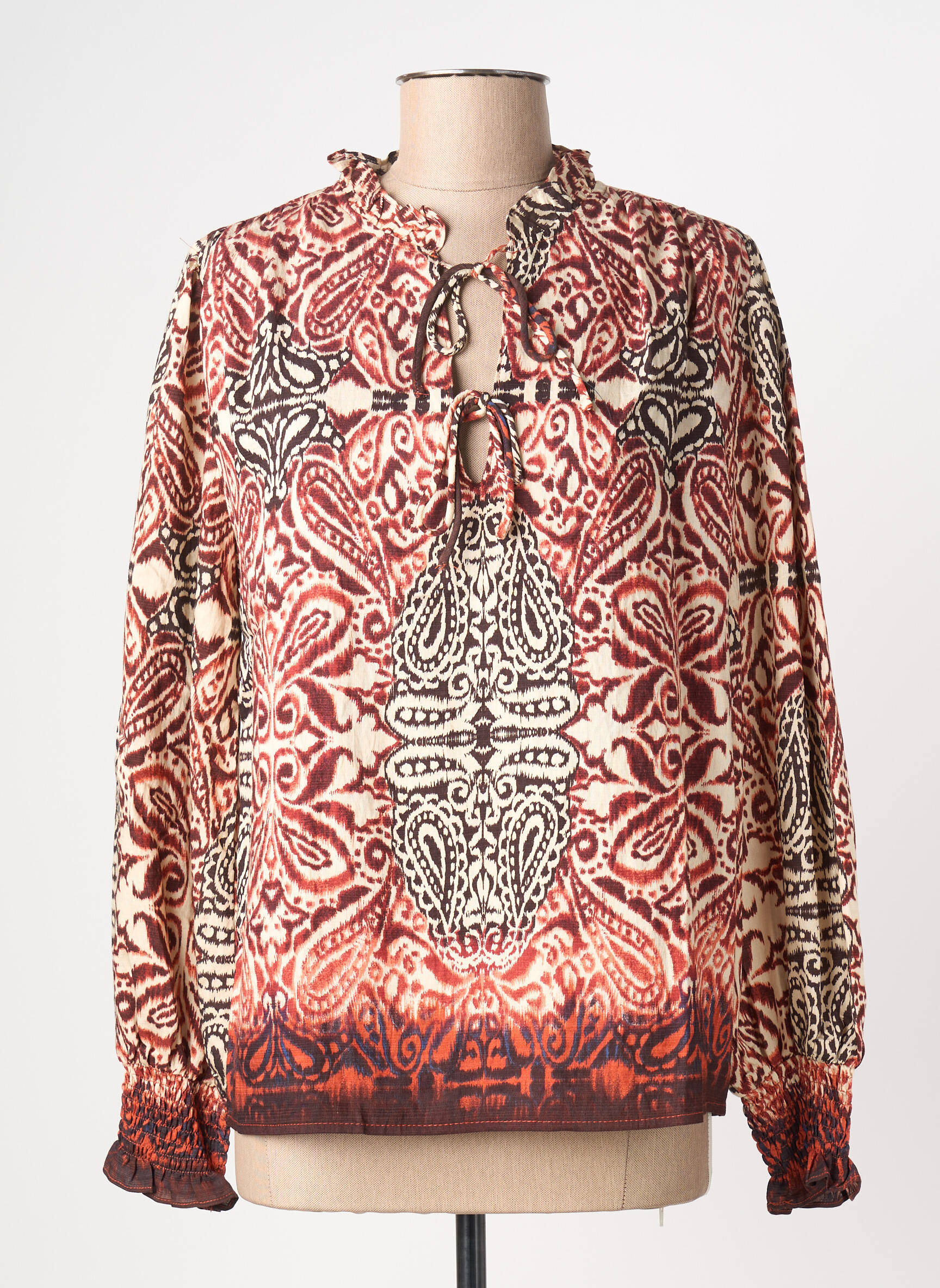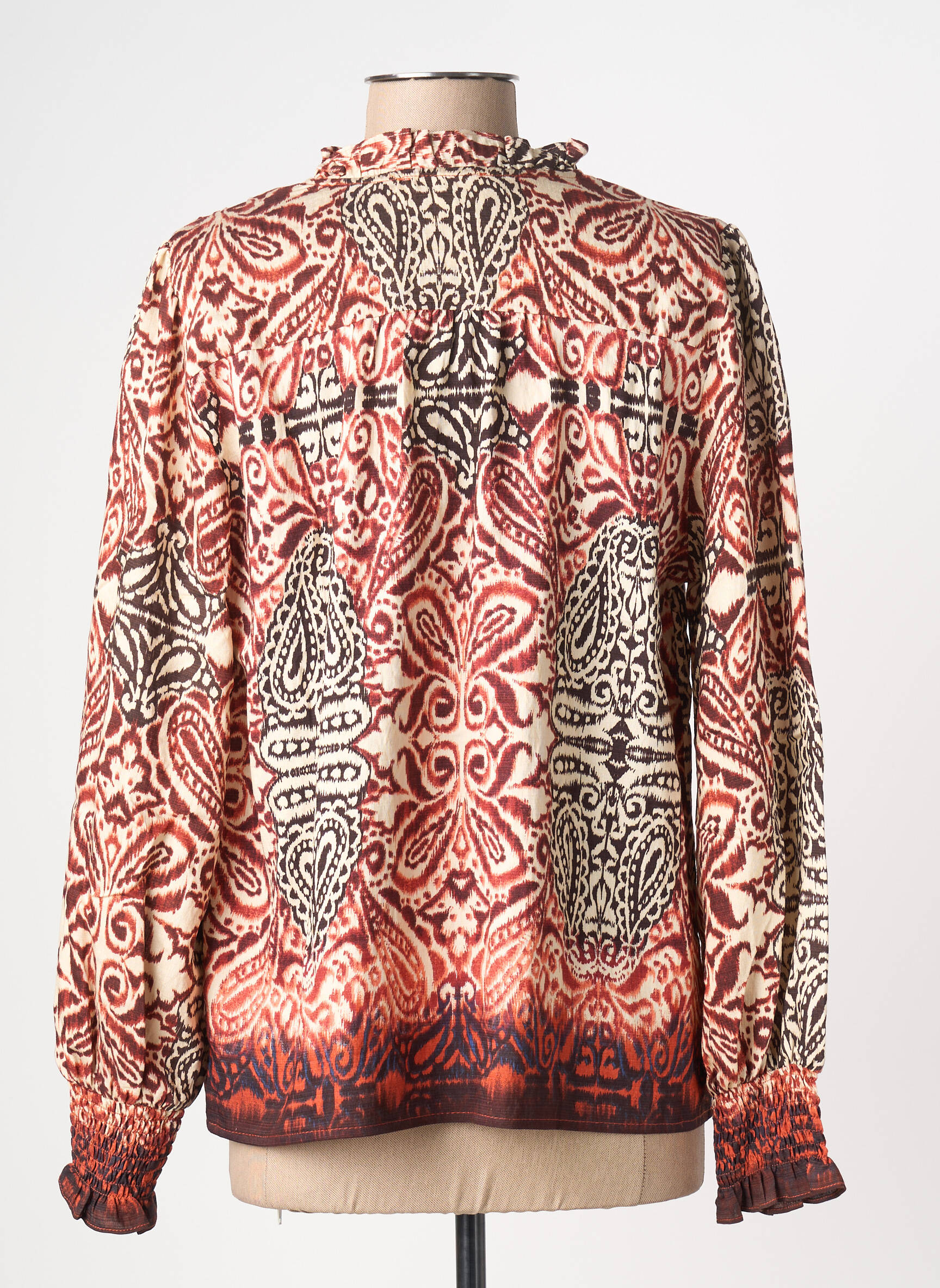 Cette blouse s’accorde idéalement avec un jean brut ou un pantalon coupe droite pour un look quotidien décontracté, mais elle se marie aussi très bien avec une jupe unie ou évasée pour une allure plus féminine. Pour accentuer le style, privilégiez des bottines en cuir ou des sandales, et ajoutez quelques bijoux discrets ou un sac en bandoulière dans des tons neutres pour rester facile à assortir et mettre en avant la richesse du motif.