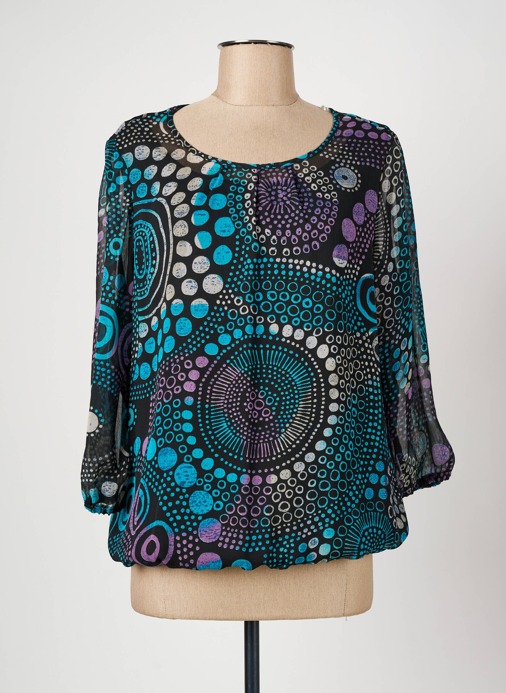 Profitez d'un style unique à prix mini avec cette blouse CHRISTINE LAURE pour femme, qui se distingue par ses motifs circulaires graphiques dans des teintes de bleu, turquoise, violet et blanc sur fond noir. Son encolure arrondie et ses manches légèrement bouffantes offrent une allure élégante et féminine, idéale pour donner du pep's à votre tenue sans vous ruiner. Cette pièce allie originalité et confort, pour un look tendance à petit prix, parfait pour faire de bonnes affaires tout en renouvelant votre garde-robe.