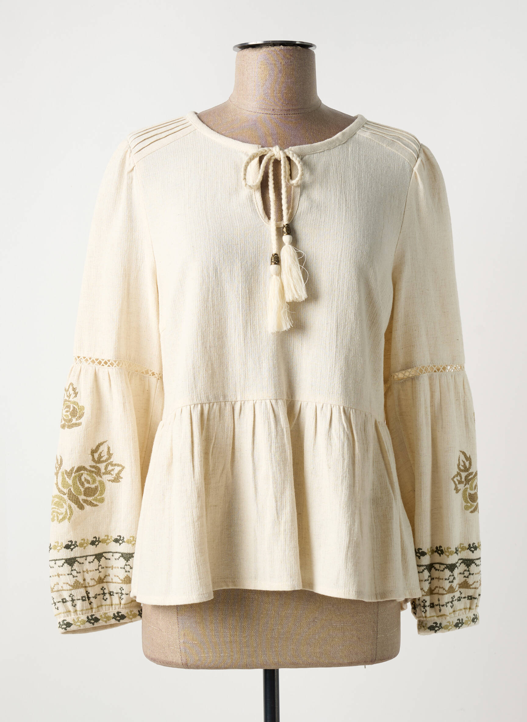 Craquez pour cette blouse de la marque CREAM à prix mini, une véritable aubaine pour donner du style à votre dressing sans vous ruiner. Son tissu léger écru se distingue par des broderies florales raffinées sur les manches larges et par sa coupe fluide, soulignée d’un joli lien à pompons à l’encolure. C’est la pièce idéale pour apporter une touche bohème chic à vos tenues tout en profitant d’un bon plan mode irrésistible.
