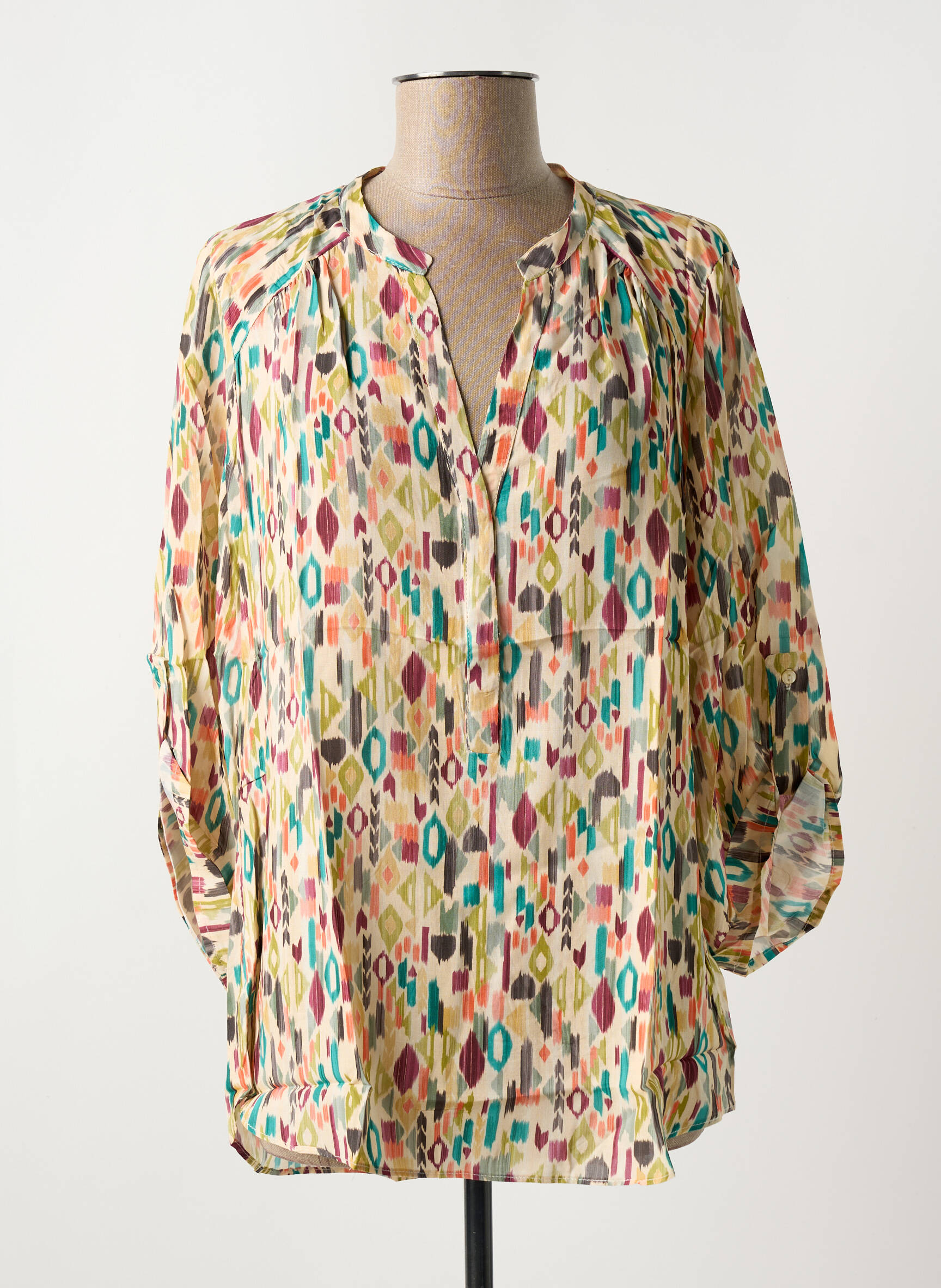 Profitez d’un bon plan mode avec cette blouse EMA BLUE'S pour femme, à petit prix et au style original, parfaite pour égayer votre garde-robe sans vous ruiner. Son imprimé multicolore aux motifs géométriques apporte une touche de fraîcheur et de modernité, tandis que sa coupe ample et ses manches longues vous offrent un maximum de confort au quotidien. Saisissez cette opportunité d’adopter un look tendance tout en faisant des économies.