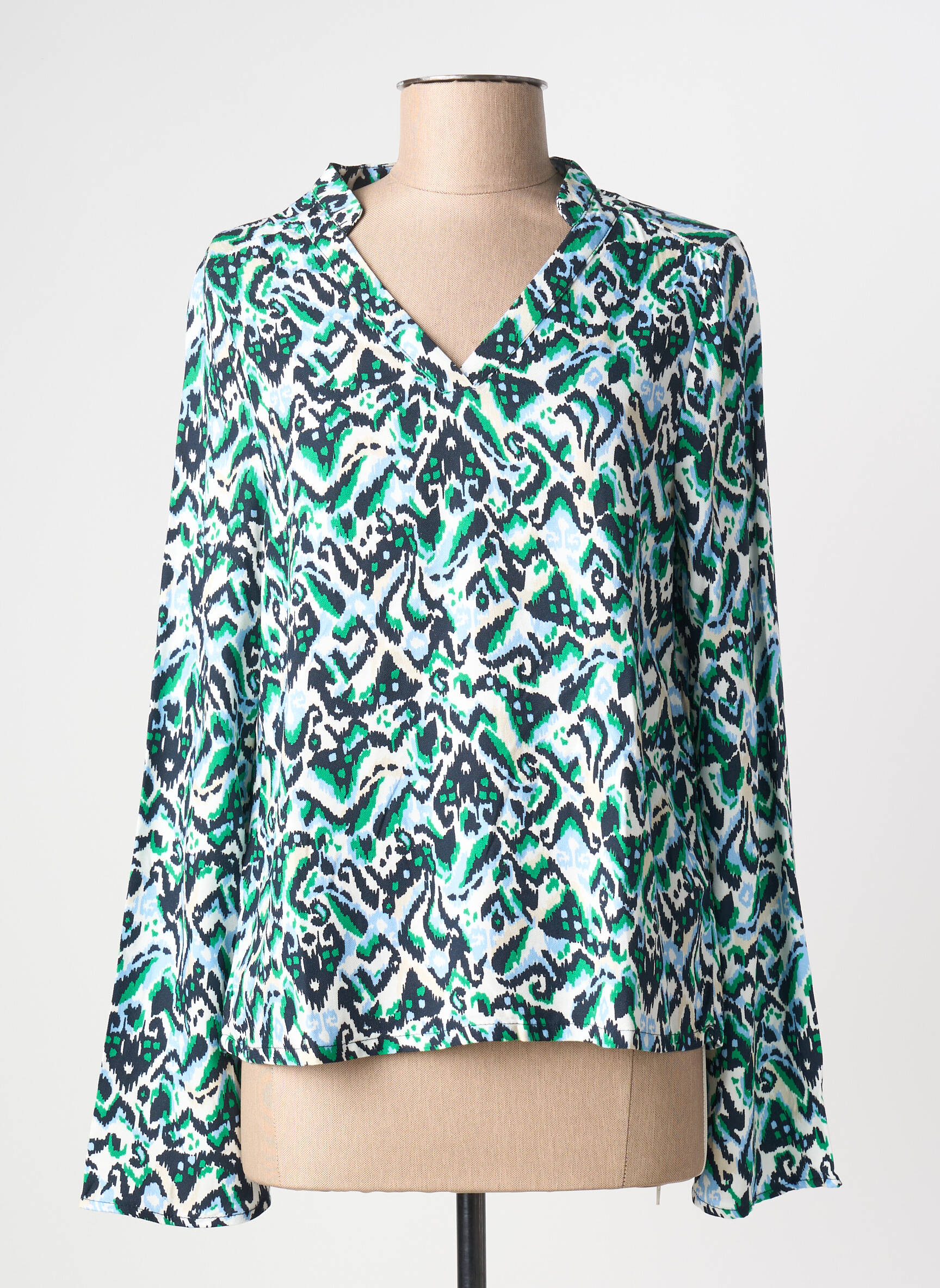 Profitez d’un vrai bon plan avec cette blouse ÉTYMOLOGIE pour femme, qui allie style et économie sans compromis. Son motif graphique dynamique aux nuances de vert, bleu et noir donne une touche d’originalité à vos tenues tout en restant facile à associer, et sa coupe fluide avec col en V apporte à la fois confort et élégance au quotidien. C’est la pièce idéale à petit prix pour renouveler votre garde-robe sans vous ruiner.