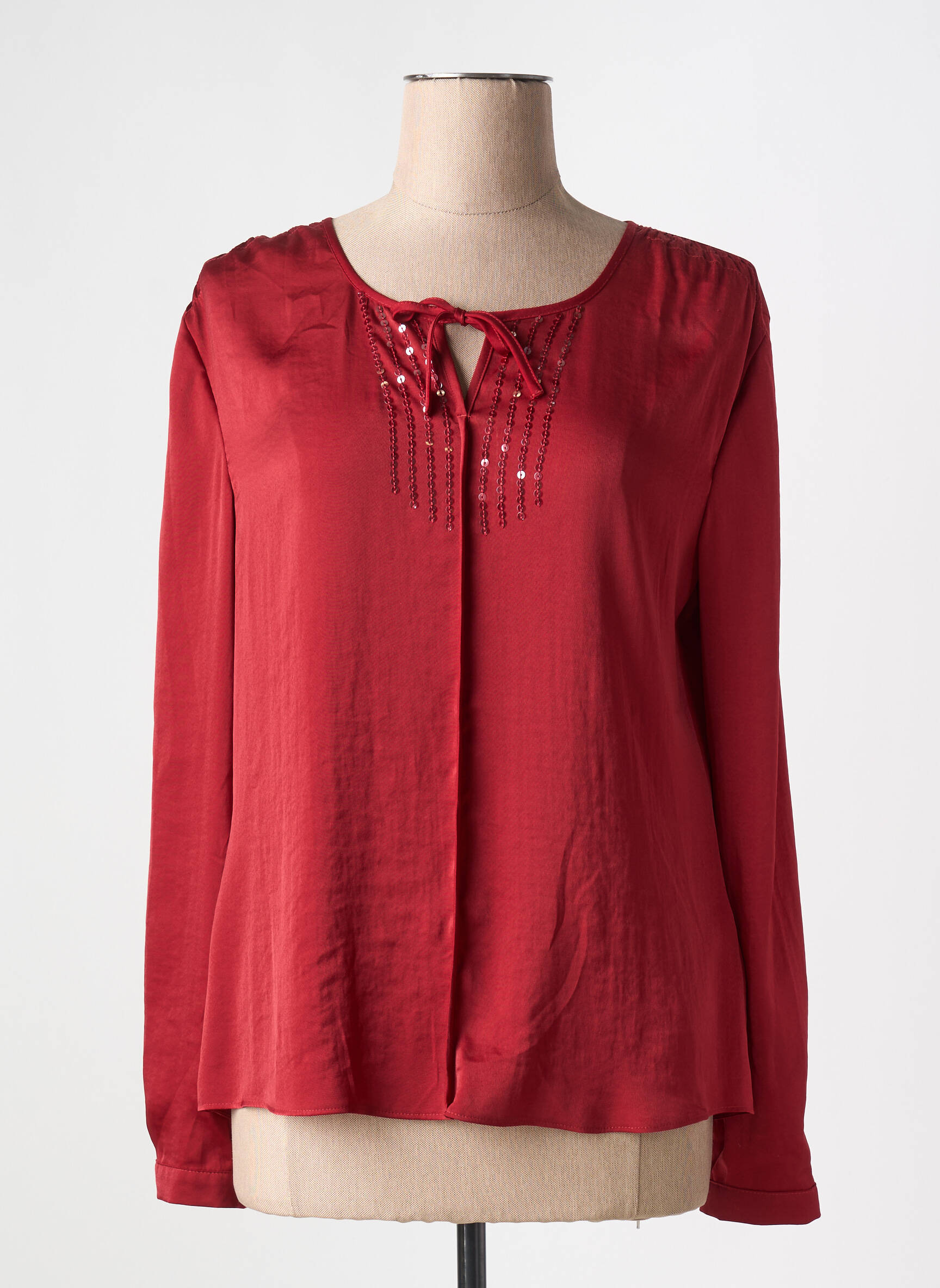 Profitez d'une superbe opportunité avec cette blouse pour femme GERRY WEBER à prix tout doux, parfaite pour apporter une touche élégante à votre garde-robe sans vous ruiner. Son tissu fluide met en valeur une ravissante teinte rouge profond, tandis que l'encolure ornée de sequins brillants et d'un petit lien à nouer ajoute une note sophistiquée et tendance, idéale pour sublimer vos tenues de tous les jours ou vos sorties.
