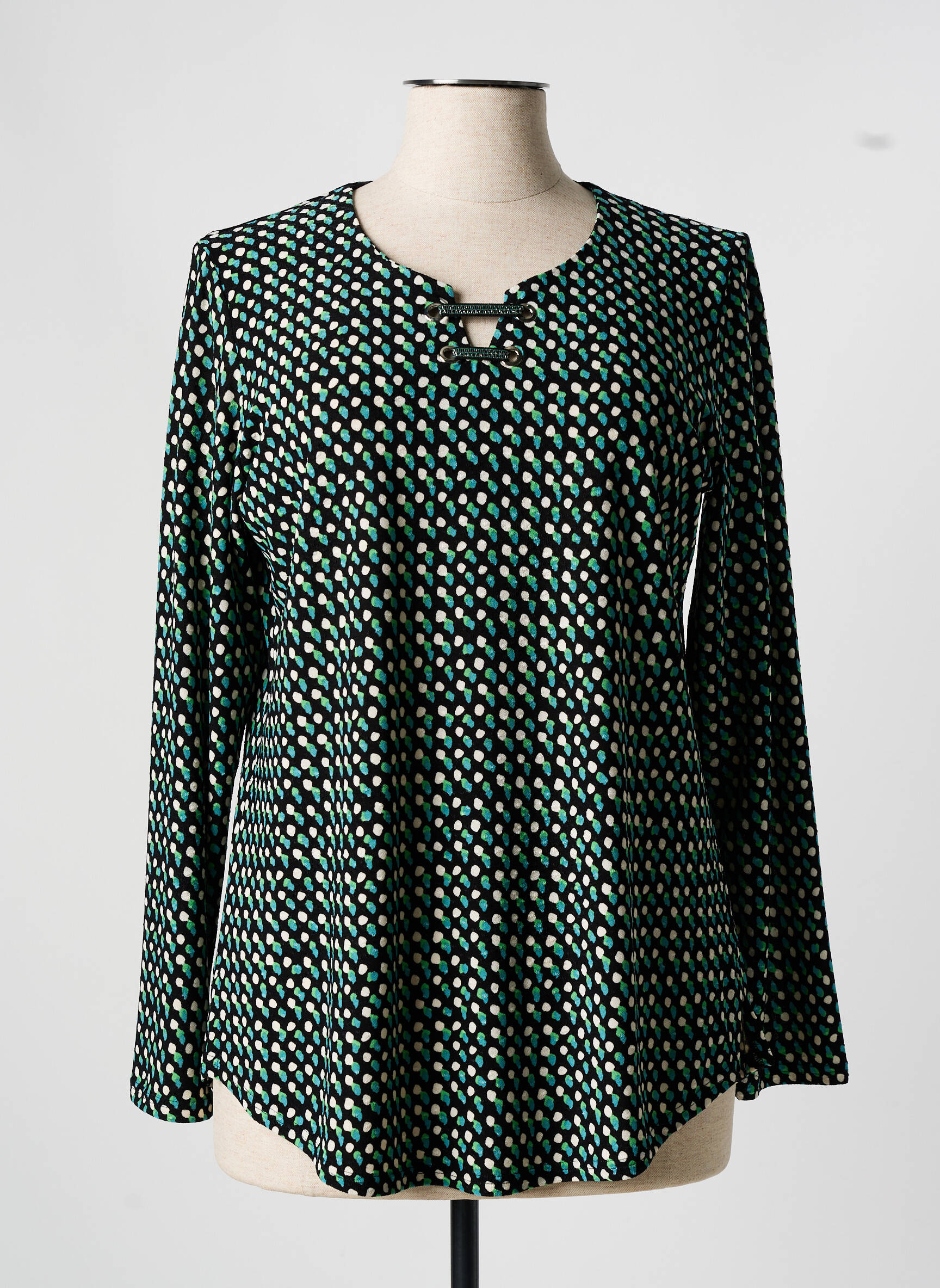 Voici une occasion à ne pas manquer pour vous offrir cette blouse femme de la marque GEVANA à prix tout doux. Son imprimé graphique mêle subtilement le noir, le vert et le beige pour un effet moderne et facile à assortir, tandis que sa coupe fluide assure confort et élégance au quotidien. Avec sa petite découpe originale au col et ses manches longues, cette blouse devient vite une pièce incontournable de votre dressing sans vous ruiner.