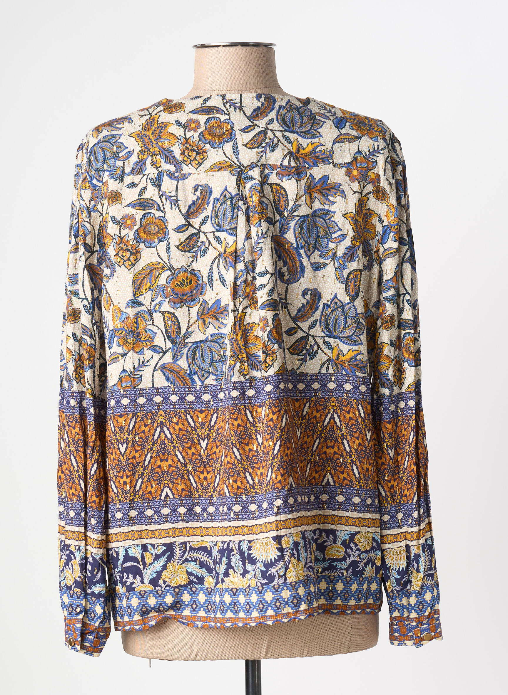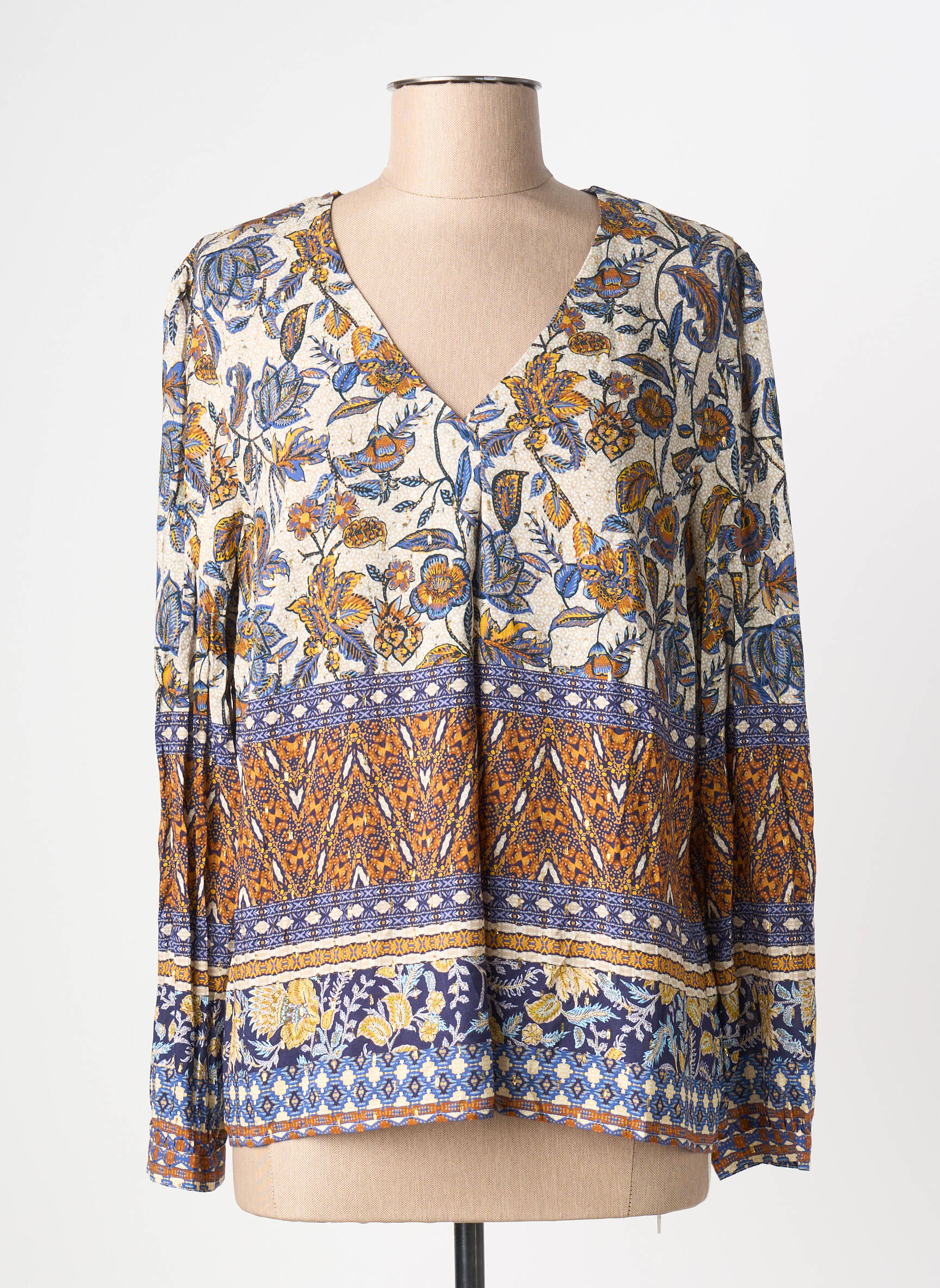 Craquez pour cette blouse Julie Guerlande pour femme qui allie élégance et petit prix, idéale pour celles qui aiment faire de bonnes affaires sans sacrifier leur style. Son imprimé floral aux teintes de bleu, orange et écru apporte une touche bohème tout en étant facile à associer à un jean ou un pantalon uni. Le col en V flatte la silhouette et la coupe légèrement ample garantit un confort au quotidien, parfait pour une allure chic à prix vraiment doux.