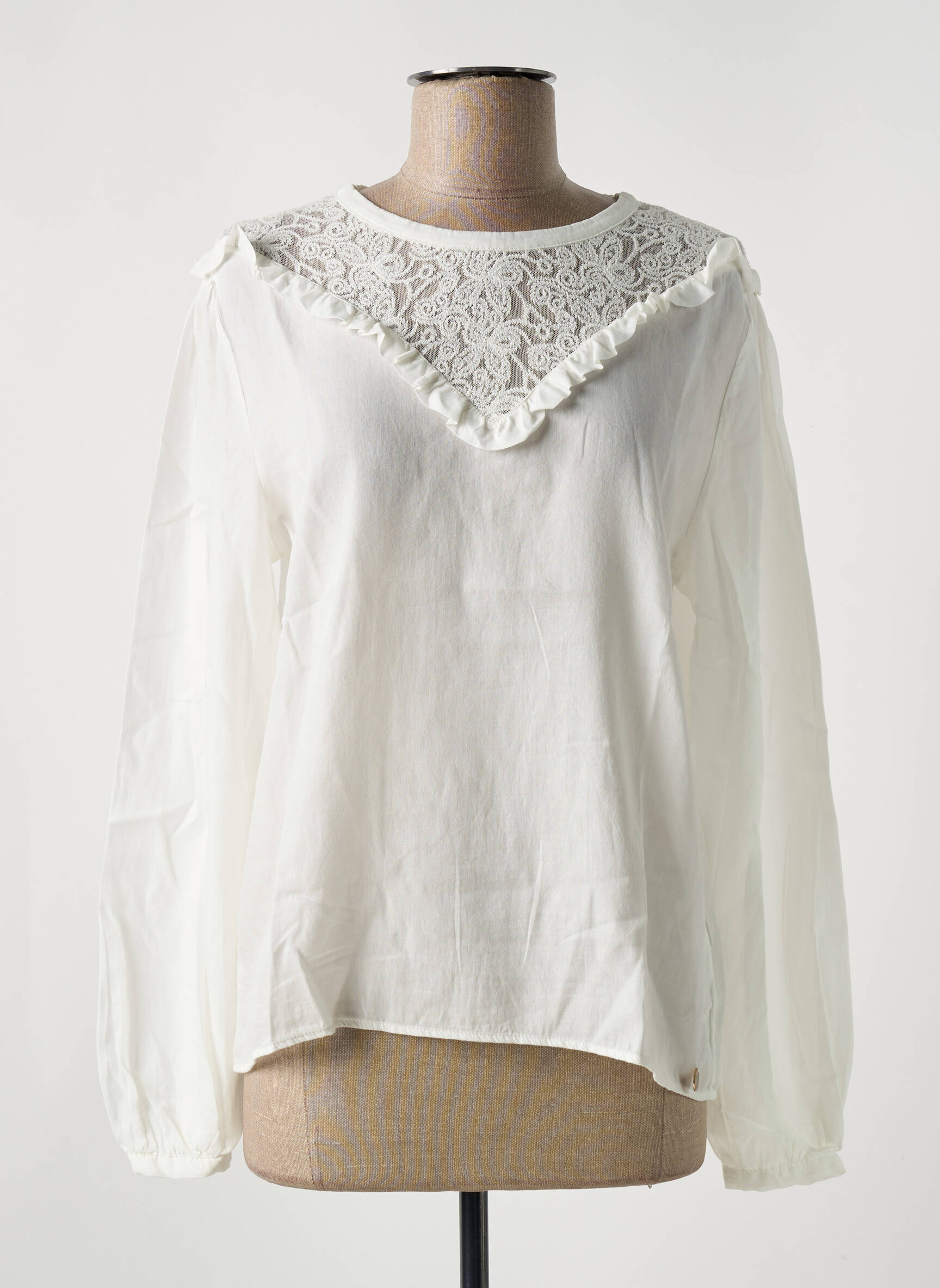 Profitez d'une offre exceptionnelle avec cette blouse pour femme signée LE BOUDOIR D'EDOUARD, idéale pour ajouter une note raffinée à petit prix à votre garde-robe. Ce modèle séduit par son col délicatement orné de dentelle et de petits volants, tout en offrant une allure élégante et légère grâce à sa coupe fluide et ses manches longues légèrement bouffantes. Un bon plan mode à saisir pour celles qui souhaitent allier charme et économies.
